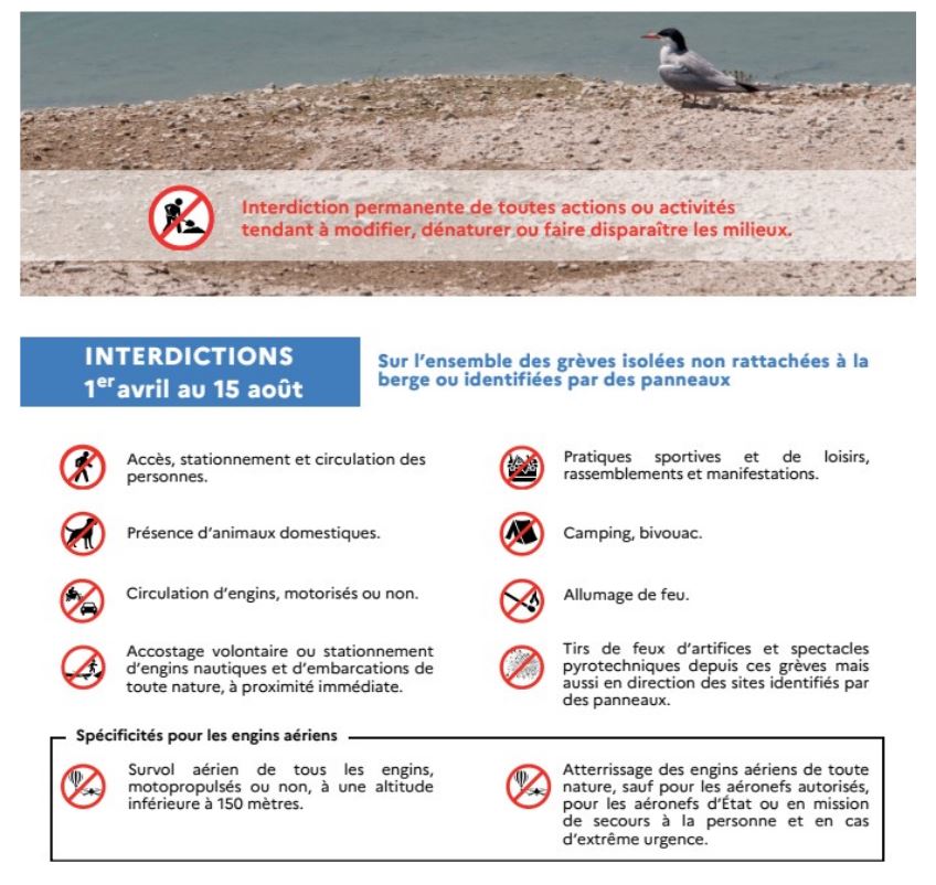 Afin de préserver l’avifaune ligérienne, l’accès et les usages des grèves de la Loire font l’objet d’une réglementation spécifique. Certaines interdictions s’appliquent plus particulièrement entre le 1er avril et le 15 août, période de nidification durant laquelle les oiseaux, ainsi que l’équilibre biologique du milieu, sont particulièrement vulnérables. Chaque printemps, plusieurs espèces d’oiseaux migrateurs rejoignent la Loire en Anjou après avoir hiverné en Afrique. Parmi elles, deux espèces emblématiques et fragiles, la sterne naine et la sterne pierregarin, trouvent sur les bancs de sable des conditions favorables à leur reproduction. Le département de Maine-et-Loire constitue le principal territoire d’accueil des populations ligériennes de sternes. À ce titre, il porte une responsabilité majeure dans la préservation de ces espèces protégées et menacées. Dans ce contexte, un arrêté préfectoral de protection du biotope (APPB) des grèves de la Loire, couvrant le secteur de La Daguenière à Montsoreau, a été signé le 6 février 2025. Cet arrêté vise à renforcer et étendre les mesures de protection existantes. L’APPB ainsi que les documents d’information associés sont consultables sur le site des services de l’État à l’adresse suivante : https://www.maine-et-loire.gouv.fr/ (rubrique : Actions de l’État / Eau et Environnement / Biodiversité / Espaces à fort enjeu / Arrêté préfectoral de protection).