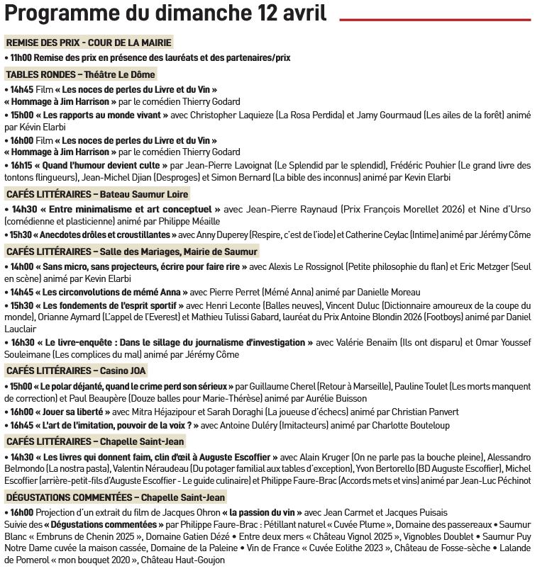 Rencontres des écrivains avec le public, remise des prix littéraires, tables rondes, cafés littéraires, lectures, impromptus musicaux, initiation aux arts du vin et dégustation de produits du terroir émailleront comme chaque année la manifestation, placée cette année sous le signe de l’Humour. La recette sera donc la même pour ce nouveau Livre et Vin avec plus de 110 auteurs présents (voir la liste ici), où des personnalités (Pascal Bataille, Alessandro Belmondo, Valérie Benaïm, Dominique Besnehard, Catherine Ceylac, Charlelie Couture, Olivier Delacroix, Anny Duperey, Antoine Duléry, Thomas Dutronc, Jamy Gourmaud, Alexis Le Rossignol, Henri Leconte, Macha Méril, Chef Peper, Pierre Perret, Jean-Pierre Raynaud, Claude Sérillon) côtoient des auteurs locaux (Pierre Creet, Alexia Dudouit, Franck Fortuna, Pierre Gay, Erwan Lescob, Sophie Puls, Bernard Wuthrich…). En plus de cette occasion de rencontrer de nombreux auteurs, des viticulteurs de toute la France et de remettre les prix des lauréats de cette édition (relire notre article sur le sujet), Les Journées du Livre et du Vin sont aussi tout un programme de rencontres, tables-rondes, échanges. Au programme, 20 cafés littéraires et 4 tables-rondes. Ces temps auront lieu sur le bateau Saumur Loire, au théâtre du Dôme, dans la chapelle Saint-Jean ou encore dans la salle des mariages de la mairie.