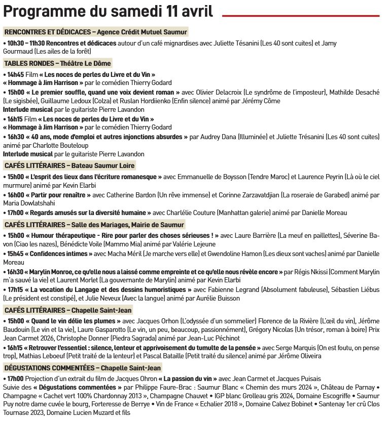 Infos pratiques : Journées du Livre et du Vin, 11 et 12 avril au théâtre du Dôme et en centre-ville de Saumur. Samedi de 14h30 à 19h et dimanche de 10h à 18h. Entrée : 11 euros par jour ou 16 euros pour le pass 2 jours. Plus d’infos sur https://livreetvin.org/.