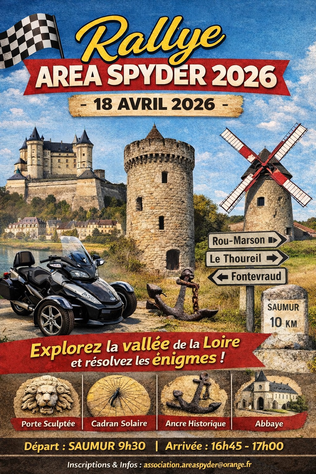 L’association AREA CAN-AM SPYDER 49 organise le samedi 18 avril, de 9h à 18h, la 6ᵉ édition de son traditionnel Rallye Énigmes, un rendez-vous désormais incontournable pour ses adhérents. Cette nouvelle édition se déroulera au cœur du Saumurois, avec un parcours reliant Saumur centre, Le Thoureil, Montsoreau, Fontevraud, Souzay-Champigny, Montreuil-Bellay et Rou-Marson.
