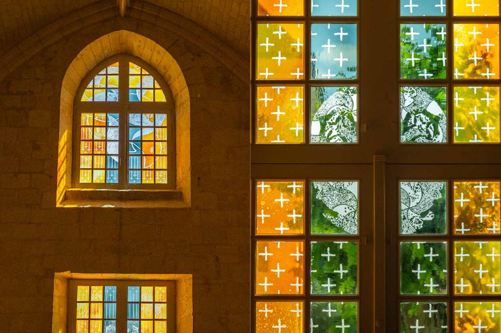 L’Abbaye royale de Fontevraud, le plus vaste ensemble monastique d’Europe, est située dans le Val de Loire, inscrit au patrimoine mondial. Elle est aujourd’hui animée par un projet culturel porté par la Région des Pays de la Loire, qui contribue au dynamisme et à l’attractivité du territoire, et propose à un public diversifié un programme associant histoire, musique et création contemporaine. Ce dialogue entre patrimoine et création, ce choc entre permanence et rupture fait partie intégrante du projet. Le réfectoire du cloître du Grand-Moûtier en est l’incarnation : permanence de la fonction, de la règle du silence, du rituel du repas ; rupture brutale des époques et des convives au sein même de ce monument de pierre passé en quelques années de haut lieu de la spiritualité à lieu d’enfermement redouté. L’Abbaye royale de Fontevraud porte dans ses gènes toutes les traces et les symboles de l’histoire de notre grande civilisation occidentale. Son architecture sublime les marqueurs de l’épaisseur du temps. L’Abbaye mène un projet culturel qui défend le devoir de transmettre et de renouveler le regard par le geste des artistes. C’est à ce titre que la Région a fait appel à François Rouan pour créer des vitraux dans le grand réfectoire, à l’emplacement des fenêtres actuelles. Cette commande concerne les façades sud et nord. Elle vise à insérer des vitrages dans les ouvertures existantes qui vont font l’objet d’une restauration complète par l’État. Le travail de François Rouan articule rigoureusement matière, couleur et structure. Il s’inscrit dans une réflexion profonde sur le support et le geste pictural, en résonance avec les problématiques de la lumière, propres à l’art du vitrail. La réalisation de vitraux pour la cathédrale de Nevers, pour le château de Hautefort et le château de Bonaguil a confirmé la pertinence de son intervention dans un cadre patrimonial, en garantissant une œuvre contemporaine dialoguant harmonieusement avec l’architecture existante.