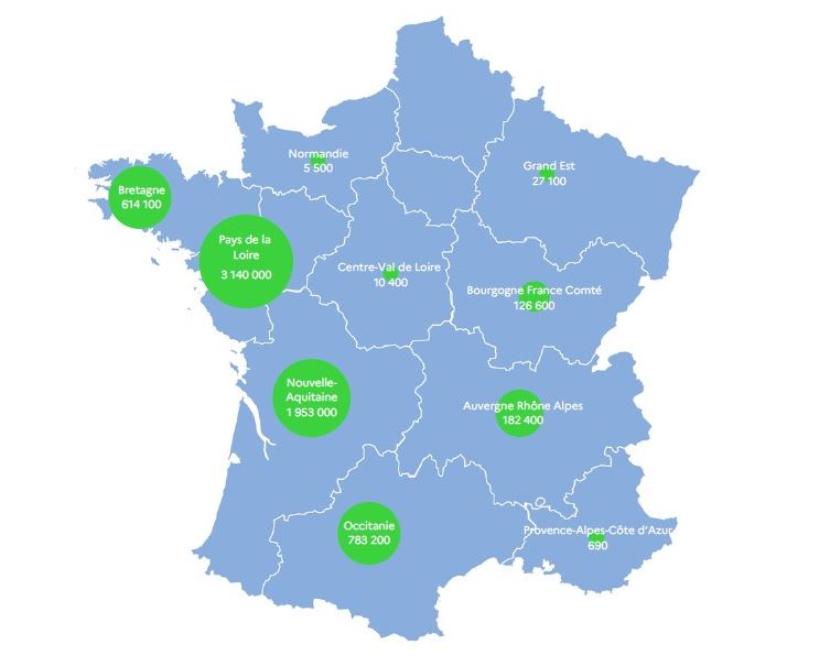 Le ministère de l’Agriculture et de la Souveraineté alimentaire a lancé à compter d’octobre 2023 une campagne de vaccination nationale contre l’influenza aviaire hautement pathogène (IAHP). Ciblée sur les canards d’élevage, cette campagne vaccinale est une première en Europe. À l’échelle internationale, elle fait de la France le premier grand pays exportateur de volailles à déployer un dispositif innovant pour renforcer la protection des élevages. La vaccination vient compléter les mesures de prévention déjà en vigueur sur le territoire métropolitain (biosécurité, mises à l’abri des animaux, surveillance…), dont le bon respect reste impératif. À la date du 19 novembre 2023, 6 893 000 canards ont reçu une première dose de vaccin. La répartition des canards vaccinés par région est présentée ci-dessous.