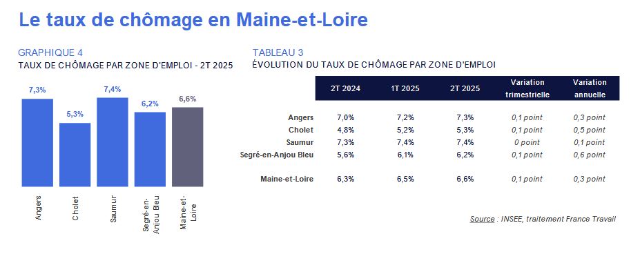 Au deuxième trimestre 2025, le taux de chômage ligérien s’établit à 6,1%. Il reste nettement inférieur à celui de la France métropolitaine (7,3%). La région des Pays de la Loire affiche le taux de chômage le plus bas parmi toutes les régions françaises, à égalité avec la Bretagne. L’évolution trimestrielle du taux de chômage est stable (0 point) pour la région et le national (relire notre article sur le 1er trimestre). Sur un an, la région Pays de la Loire voit son taux de chômage progresser de +0,3 point. Cette évolution est moins favorable qu’au niveau de la France métropolitaine avec +0,2 point. Les départements de la Sarthe (7,3%) et du Maine-et-Loire (6,6%) affichent les taux de chômage les plus élevés de la région au deuxième trimestre 2025. La Mayenne (5,5%), la Vendée (5,5%) et la Loire-Atlantique (5,9%) se distinguent par des taux de chômage nettement inférieurs. Sur un trimestre, le département de la Sarthe est le seul à connaître une évolution baissière (-0,1 point), alors que tous les autres départements de la région enregistrent une hausse de +0,1 point. L’évolution annuelle est en hausse pour tous les départements (+0.3% pour le Maine-et-Loire). Une fois encore, le territoire du Saumurois affiche le taux de chômage le plus élevé du département (voir tableau ci-dessous) avec 7.4% (stable par rapport au T1) et le troisième territoire où le taux de chômage est le plus élevé sur la région derrière Redon et le Mans.