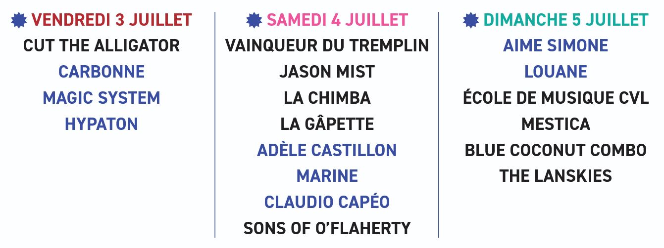 Après avoir dévoilé les têtes d’affiche de la scène payante en décembre dernier (Louane, Claudio Capéo, Magic System, Marine, Adèle Castillon, Aime Simone, Carbonne, Hypaton), le festival a annoncé sur ses réseaux sociaux les noms des artistes qui feront vibrer les 2 scènes gratuites de l’évènement les 3, 4 et 5 juillet.  Les festivaliers embarqueront dans un univers pop, rock, funk, blues... et s’envoleront vers des destinations exotiques. De quoi danser et faire la fête pendant 3 jours et sans billet, en famille ou entre amis !