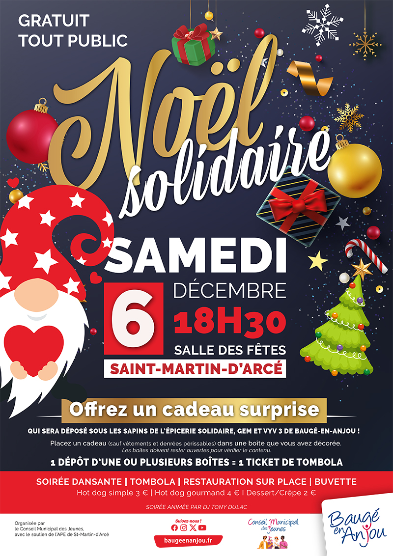 Pour la deuxième année consécutive, le Conseil Municipal des Jeunes de Baugé-en-Anjou organise une action solidaire afin de fédérer autour d’un Noël pour tous. Le samedi 6 décembre 2025 à partir de 18h30, chacun est invité à se rendre à la salle des fêtes de Saint-Martin-d’Arcé, commune déléguée de Baugé-en-Anjou, pour déposer une boîte contenant de petits cadeaux (hors produits alimentaires et vêtements). Les boîtes, laissées ouvertes seront ensuite vérifiées et répertoriées par catégories d’âges par nos jeunes élus, puis fermées et remises à l’épicerie solidaire, Vyv3 et GEM de Baugé-en-Anjou, afin que tous les baugeois aient un cadeau surprise sous le sapin lors des fêtes de Noël. La restauration et la buvette seront assurées par l’APE de Saint-Martin-d’Arcé, partenaire de l’événement, et l’animation sera confiée à Tony Dulac, DJ fidèle au soutien du CMJ. Un ticket de tombola sera remis à chaque personne remettant un ou plusieurs cadeaux, avec un tirage en fin de soirée, grâce aux nombreux lots offerts par les commerçants et artisans locaux. Cet événement est ouvert à tous et gratuit !