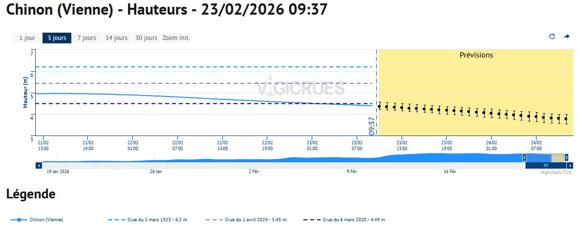 Ce dimanche 22 février, le niveau de la Loire a atteint 5,15 m à Saumur. Une décrue s’est ensuite engagée avec une cote estimée à 4,41m le 24 février. La Vienne, à Chinon, a entamé un décrue dans le week-end également. Le niveau du Thouet redescend également. Il est à 4.17m ce lundi et devrait se stabiliser autour de 4m dès demain.