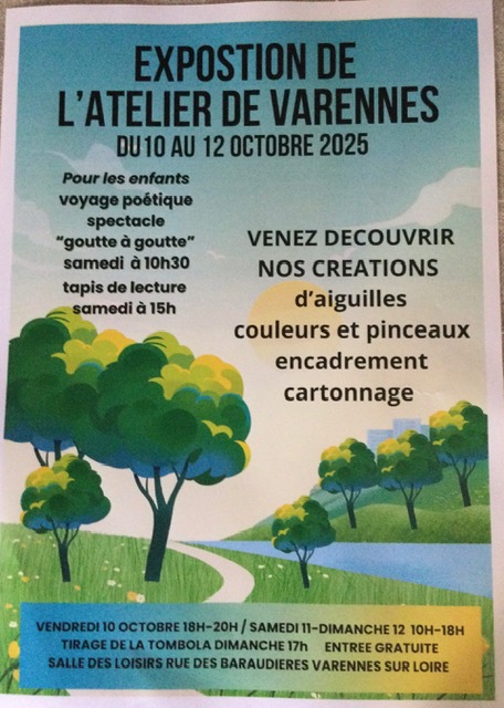 L’Atelier de Varennes présente ses œuvres de cartonnage, encadrement, peinture et travaux d’aiguilles les 10, 11 et 12 octobre à l’occasion de son exposition ni-annuelle. Le thème est : Eaux et Forêts. Animations pour les enfants le samedi à 10h30 et 15h. Buvette, tombola, concours d’encadrement…