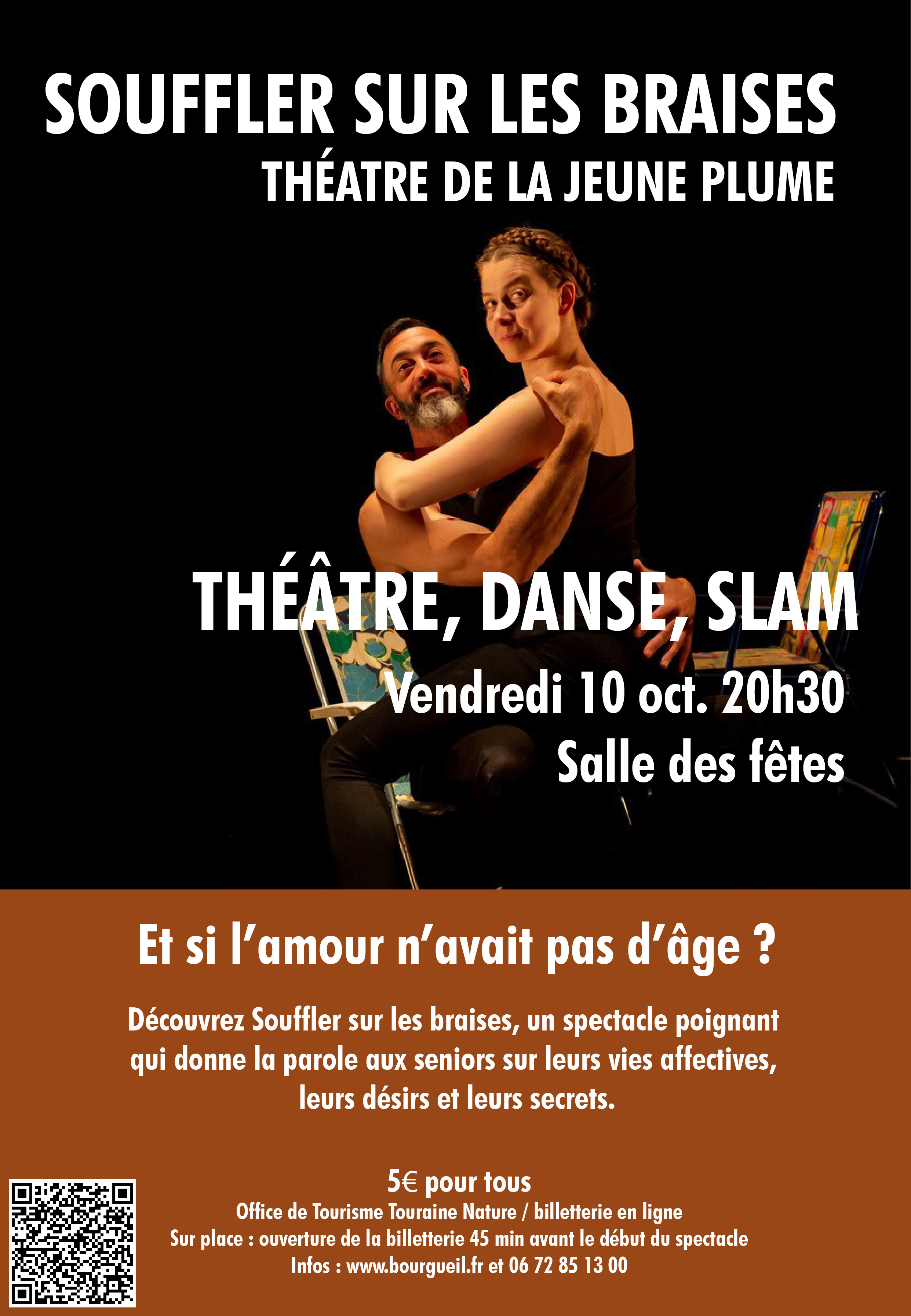 Infos pratiques : Vendredi 10 octobre à 20h30 – Salle des fêtes de Bourgueil. Réservations : Office de Tourisme Touraine Nature et billetterie en ligne >>> https://reservation.tourainenature.com/concerts-et-spectacles/saison-culturelle-de-bourgueil/gl-2025-06-souffler-sur-les-braises ou sur place : ouverture de la billetterie 45 min avant le début du spectacle. Infos : www.bourgueil.fr et 06 72 85 13 00. Venez nombreux pour un moment de partage et d’émotion !