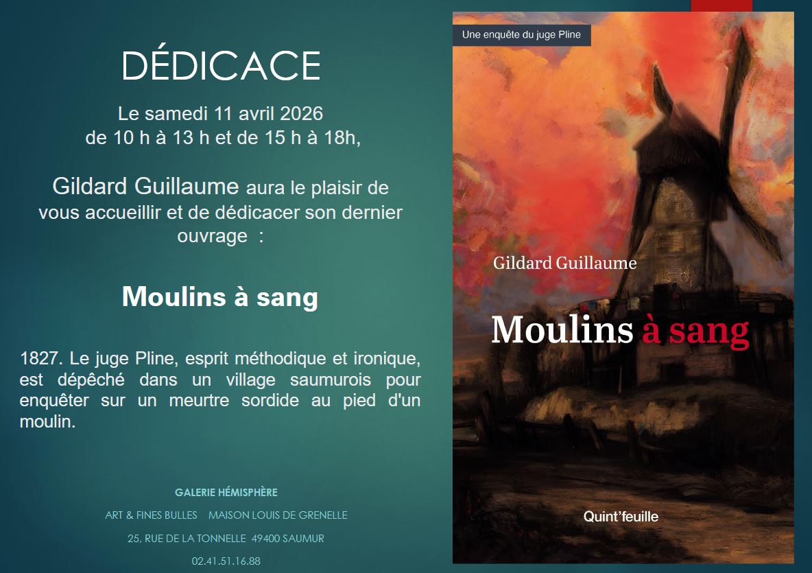Samedi 11 avril 2026, de 10h à 13h et de 15h à 18h, l’auteur saumurois Gildard Guillaume aura le plaisir de vous accueillir à la Galerie Hémisphère, Maison Louis de Grenelle, 25 rue de la Tonnelle à Saumur, et de dédicacer son dernier ouvrage de la série des enquêtes du Juge Pline, « Moulins à Sang ».