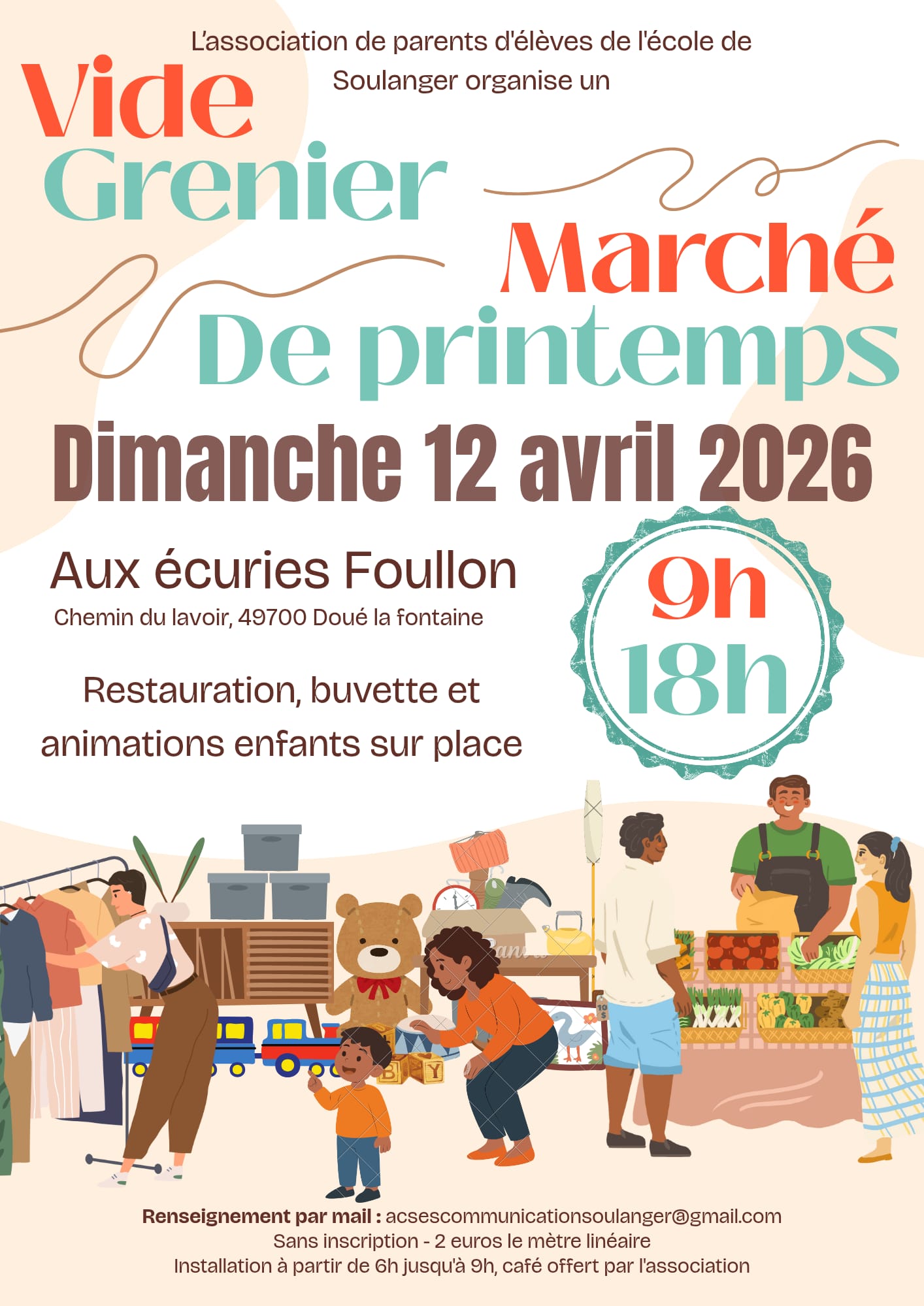 L’ACSES, association de parents d’élèves de l’école de Soulanger à Doué-La-Fontaine, organise le dimanche 12 avril 2026, un marché de printemps avec des artisans qui exposeront leurs créations/productions et en parallèle un vide grenier ouvert à tous, sans inscription. Cet événement aura lieu aux écuries Foullon.