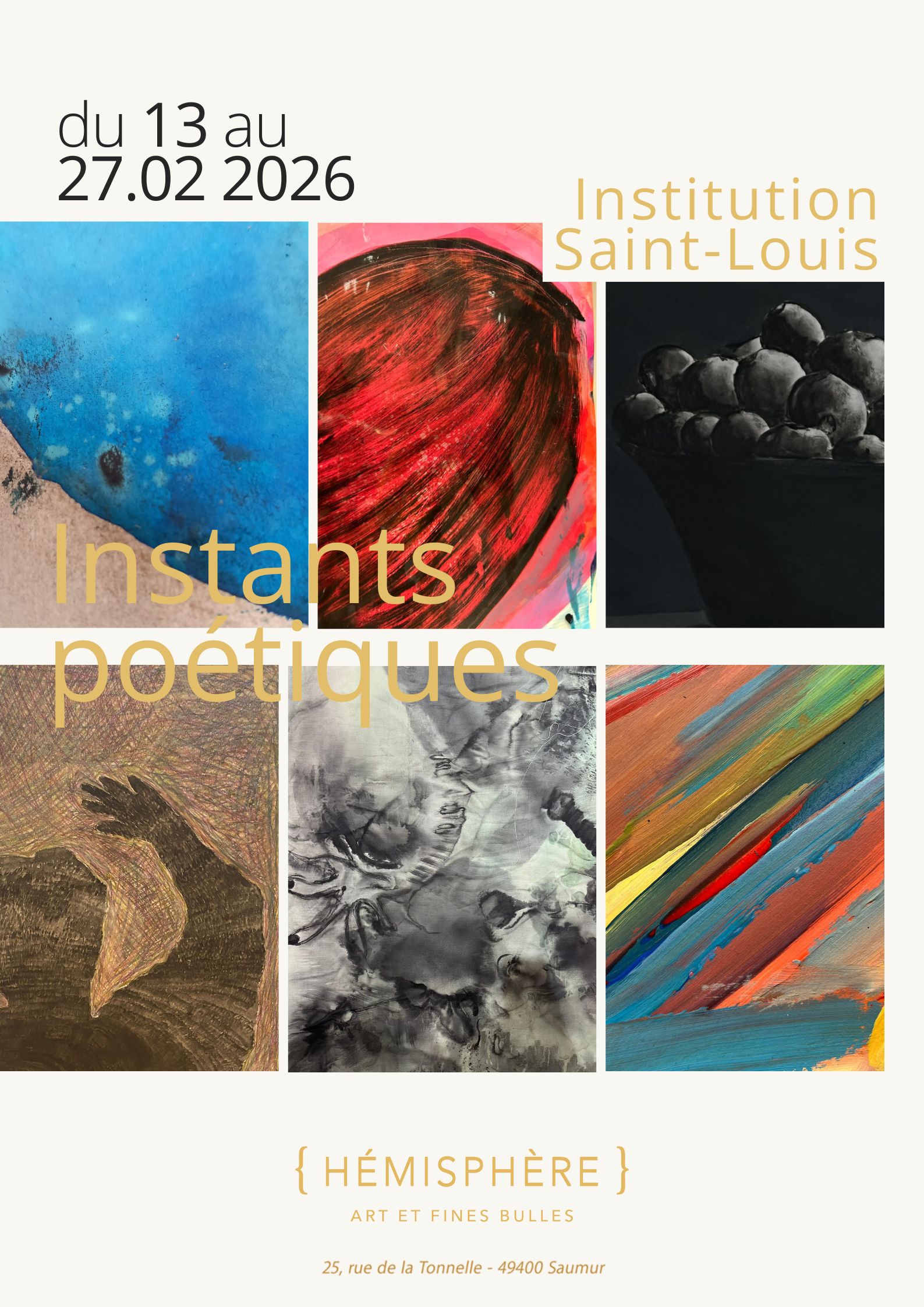Pour la 4ème édition, La galerie Hémisphère à Saumur organise l’exposition « Instants poétiques » des élèves de Terminale Spécialité Arts Plastiques du Lycée Saint Louis. Un projet artistique réalisé par les élèves en classe et qui débouche sur l’expérience de l’exposition en milieu professionnel. A travers cette exposition, les lycéens nous invitent : « A poser un regard neuf sur les choses banales, à considérer l’insignifiant, l’invisible à nos yeux… À s’arrêter sur ce quotidien de notre existence commune. »