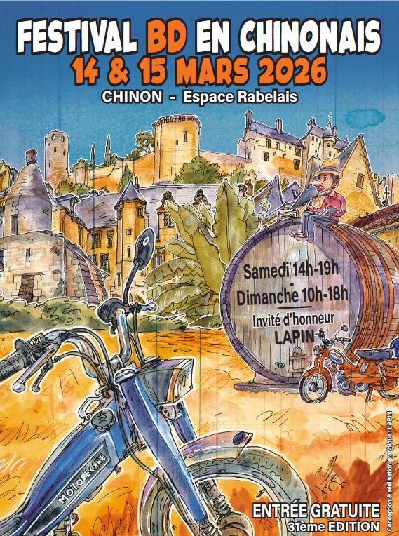 Avec le soutien de la ville de Chinon, de la Communauté de COmmunes Chinon Vienne et Loire, la Région et le département, l’association CLAAC organise sa 31ème édition du festival BD en Chinonais. 21 auteurs seront présents, avec à l’honneur cette année, Lapin, carnettiste et pilier de Croq and Mob. « Le festival est gratuit, notre objectif est d’initier à la BD, à travers la rencontre d’auteurs par le biais des dédicaces notamment, des espaces de lecture libre, des expositions de planches originales, mais aussi des reproductions, des animations, des ateliers, battle de dessin, concours de BD… », commente l’association.