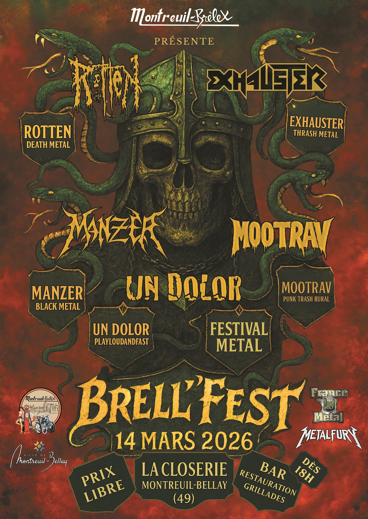 L’association Montreuil Brelex de Montreuil-Bellay organise le samedi 14 mars 2026 à 18h à la salle de la Closerie un festival métal. Cinq groupes seront programmés lors de cette soirée : Manzer, Exhauster, Rotten, UN DOLOR, MOOTRAV. « Le Brell’Fest c’est 5 groupes survoltés pour une déferlante metal qui va retourner Montreuil », souligne l’association. Petit tour d’horizon de cette programmation originale sur le territoire saumurois.