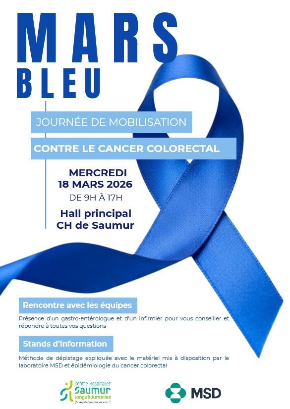 Le centre hospitalier de Saumur organise régulièrement des événements de sensibilisation pour le grand public. En mars, l’établissement de santé proposera une action autour de la prévention du cancer colorectal le 18 mars. Présence d’un gastro-entérologue et d’un infirmier pour vous conseiller et répondre à toutes vos questions. Méthode de dépistage expliquée avec le matériel mis à disposition par le laboratoire MSD et épidémiologie du cancer colorectal.