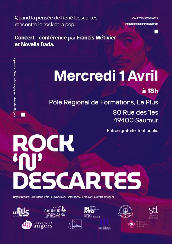 Le mercredi 1 avril 2026, le Pôle de formation de Saumur, le PLUS, en partenariat avec LAREMA de l’université d’Angers organise un événement unique et original. Un concert-conférence animé par Francis Métivier et Novella Dada autour de la pensée de René Descartes mise en perspective au travers de la musique rock et pop. Une conférence gratuite et tout public.