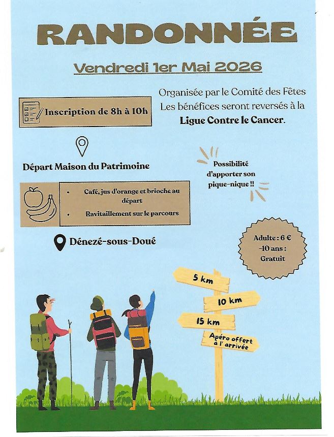 Le comité des fêtes de Dénezé-sous-Doué organise une randonnée pédestre et solidaire le vendredi 1 mai au départ de la Maison du Patrimoine. Trois parcours accessibles à tous vous sont proposés : 5 km, 10 km, 15 km, permettant à chacun de marcher à son rythme et ses envies. Des ravitaillements sont prévus sur les 10 et 15 km afin de garantir confort et énergie tout au long du trajet. Les inscriptions se feront sur place de 8h à 10h. Le tarif est de 6 euros pour les adultes et gratuit pour les moins de 10 ans. Au-delà du plaisir de la marche et de la découverte des paysages, cette randonnée a une dimension solidaire: l’ensemble des bénéfices sera reversé à la ligue contre le cancer. Venez nombreux partager un moment sportif, convivial et engagé !