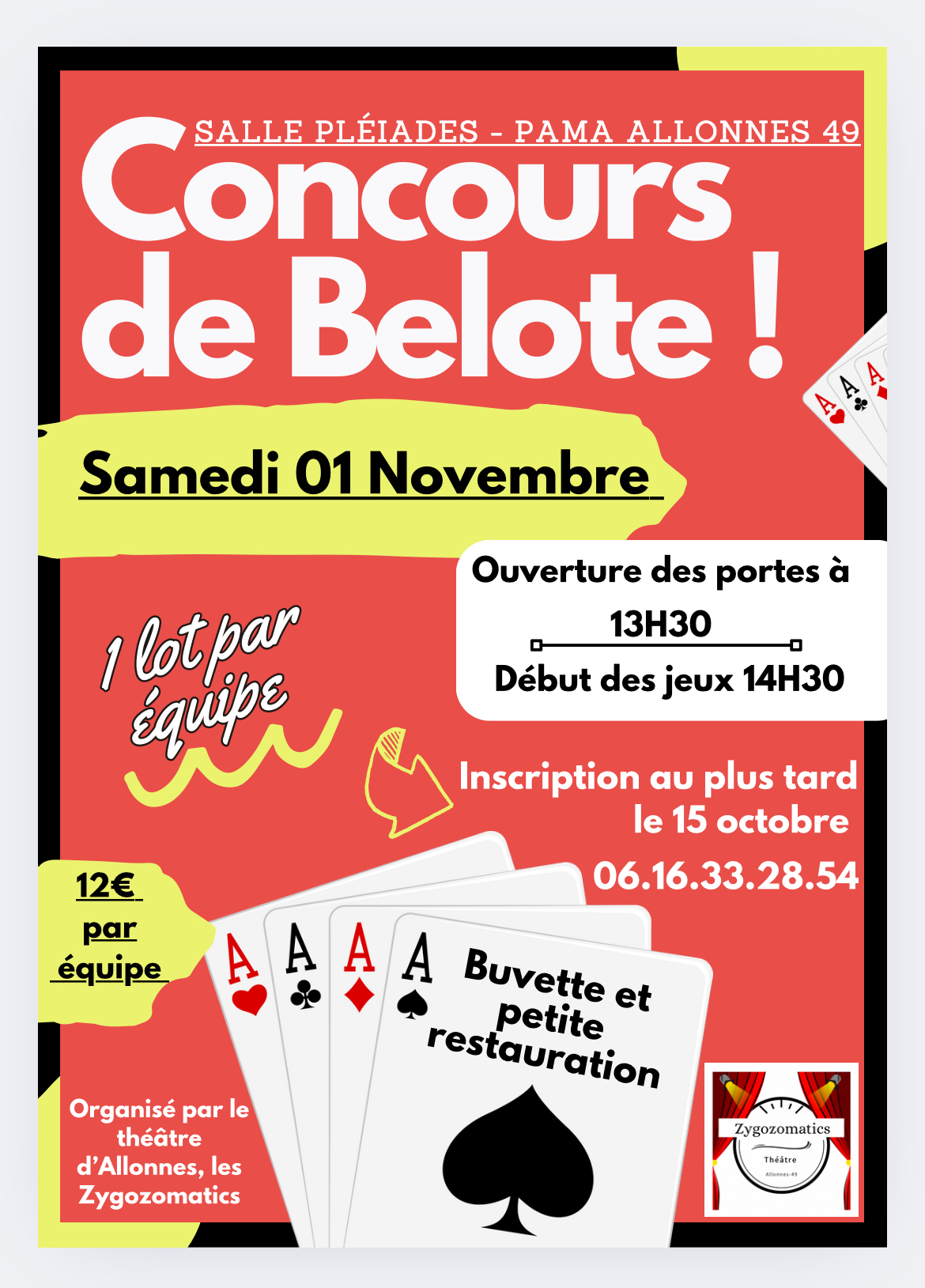 Concours de belote le samedi 1er novembre 2025 à 14h00 Salle Pléiades, Pâma Allonnes 49650. Inscription au 06.16.33.28.54. Organisé par le théâtre d’Allonnes, les Zygozomatics.