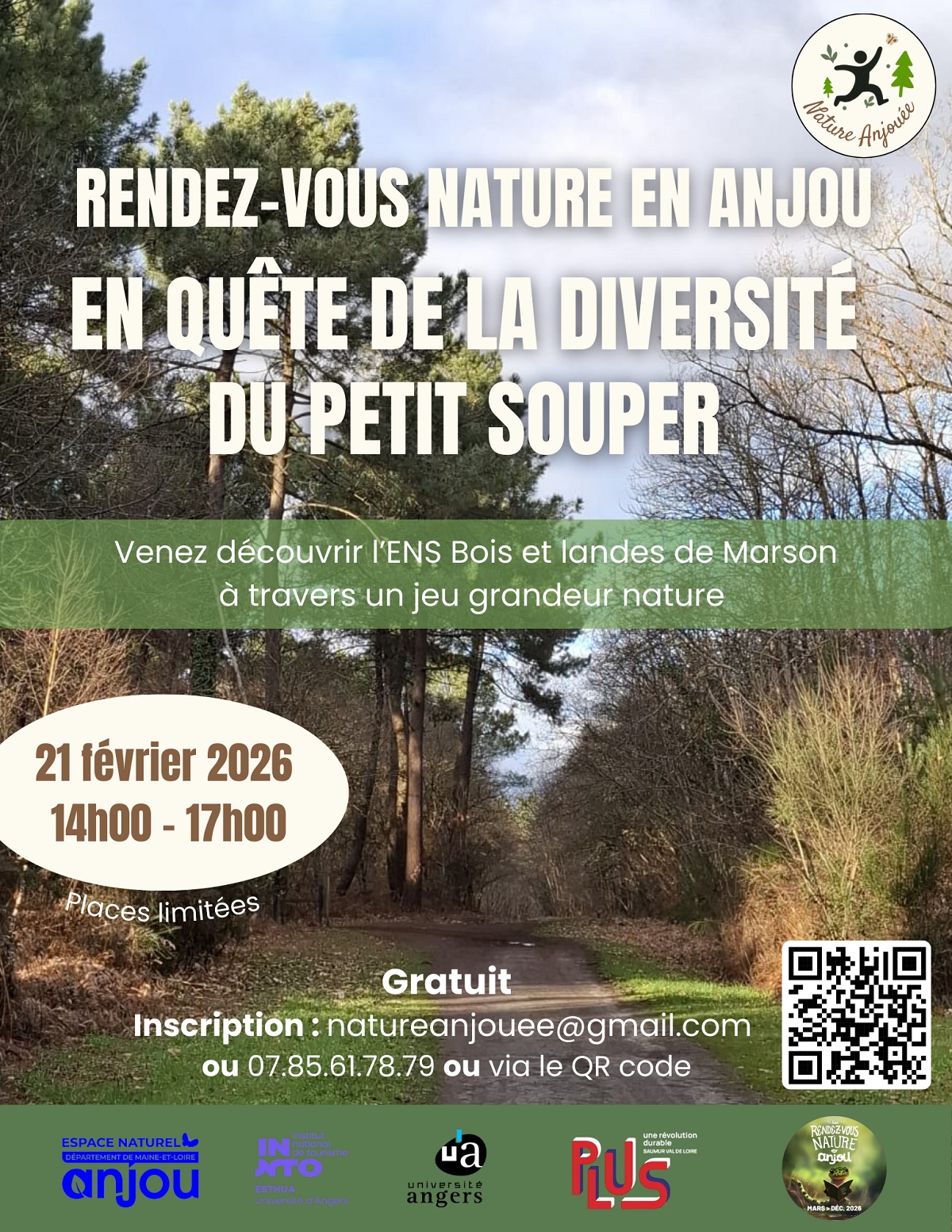 Des étudiants en licence professionnelle Écotourisme à l’ESTHUA organisent, dans le cadre de leur formation, un Rendez-Vous Nature au sein d’un Espace Naturel Sensible, suite à l’appel à projets lancé par le Département. Cette animation, « En quête de diversité du Petit Souper », aura lieu le samedi 21 février à Rou-Marson et Verrie. Le Bois du Petit Souper est riche en diversité naturelle et en équilibre avec les activités humaines. Mais que se passerait-il si une activité prenait le dessus ? Trouvez les indices de sa richesse durant un jeu grandeur nature.