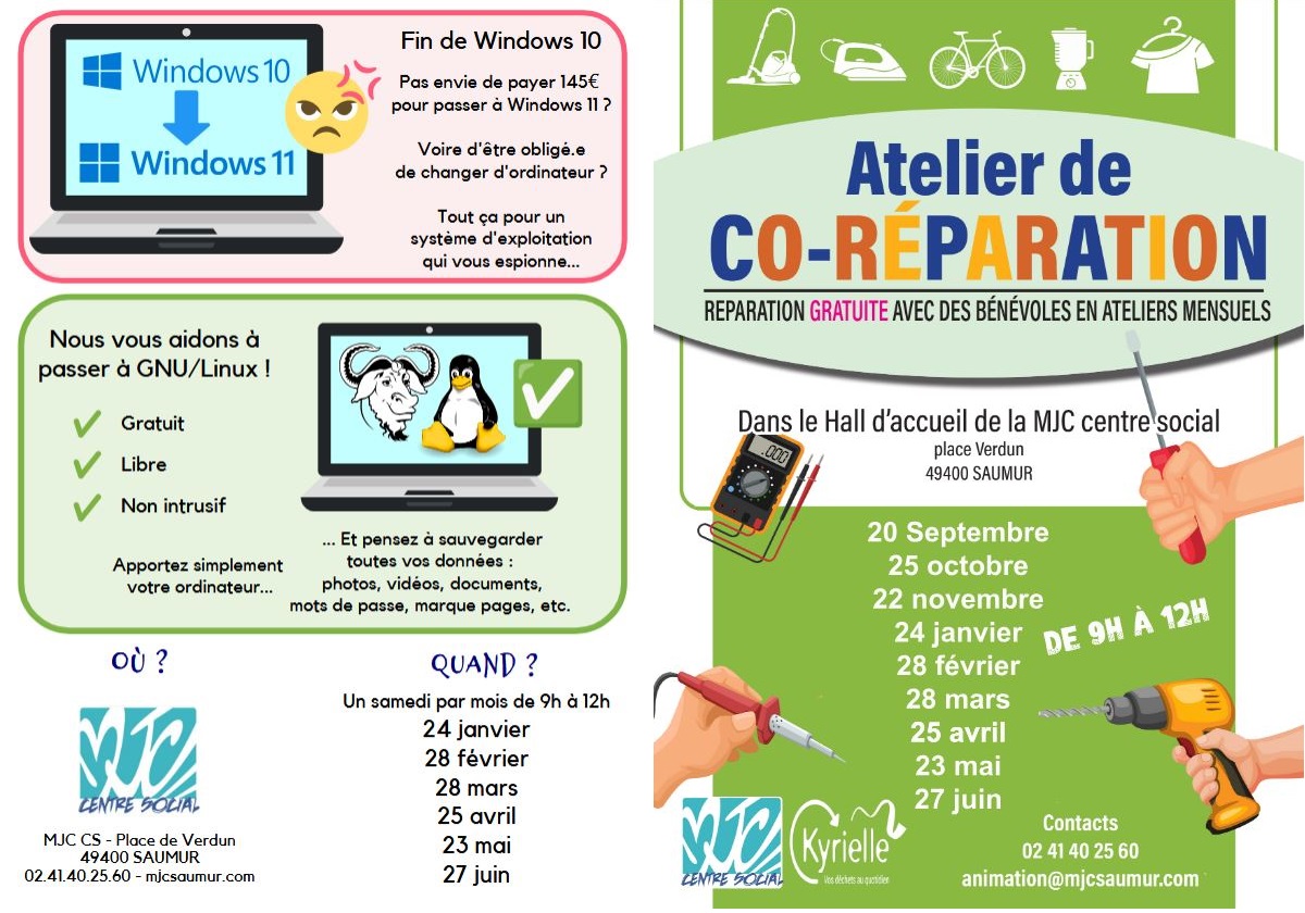 Le samedi 24 janvier se tiendra le premier atelier de co-réparation de la MJC Centre Social de Saumur, de 9h a 12h. A cette occasion se tiendra aussi un atelier Linux pour les personnes souhaitant changer de système d’exploitation et ne pas migrer vers windows 11. Ce service est gratuit, il est ouvert de 9h a 12h tout comme l’atelier « passage sous Linux ». Pour toutes informations complémentaires possibilités de joindre l’accueil de la MJC au 02 41 40 25 60.