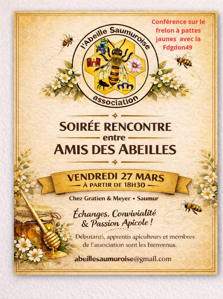 L ‘Abeille Saumuroise organise le vendredi 27 mars à partir de 18h30 un temps d’échanges entre passionnés d’apiculture. Une table ronde est prévue autour de la lutte contre le frelon asiatique. Interviendrons la FDGdon 49, la Mairie de Saumur et sous réserve le lauréat du budget participatif pour son projet de lutte contre le frelon asiatique.