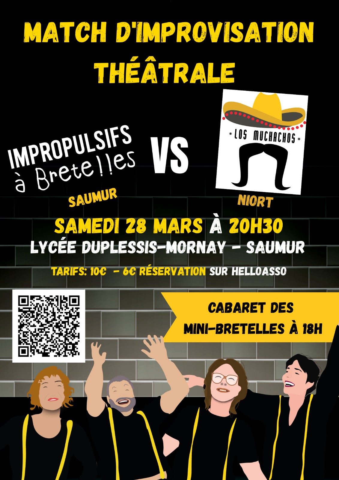 Le samedi 28 mars 2026, la troupe locale des Impropulsifs s’apprête à jouer un match d’improvisation avec los Muchachos qui viennent de Niort. Vous pourrez également profiter, en avant-première, à 18h, d’un cabaret avec nos mini-Bretelles .
