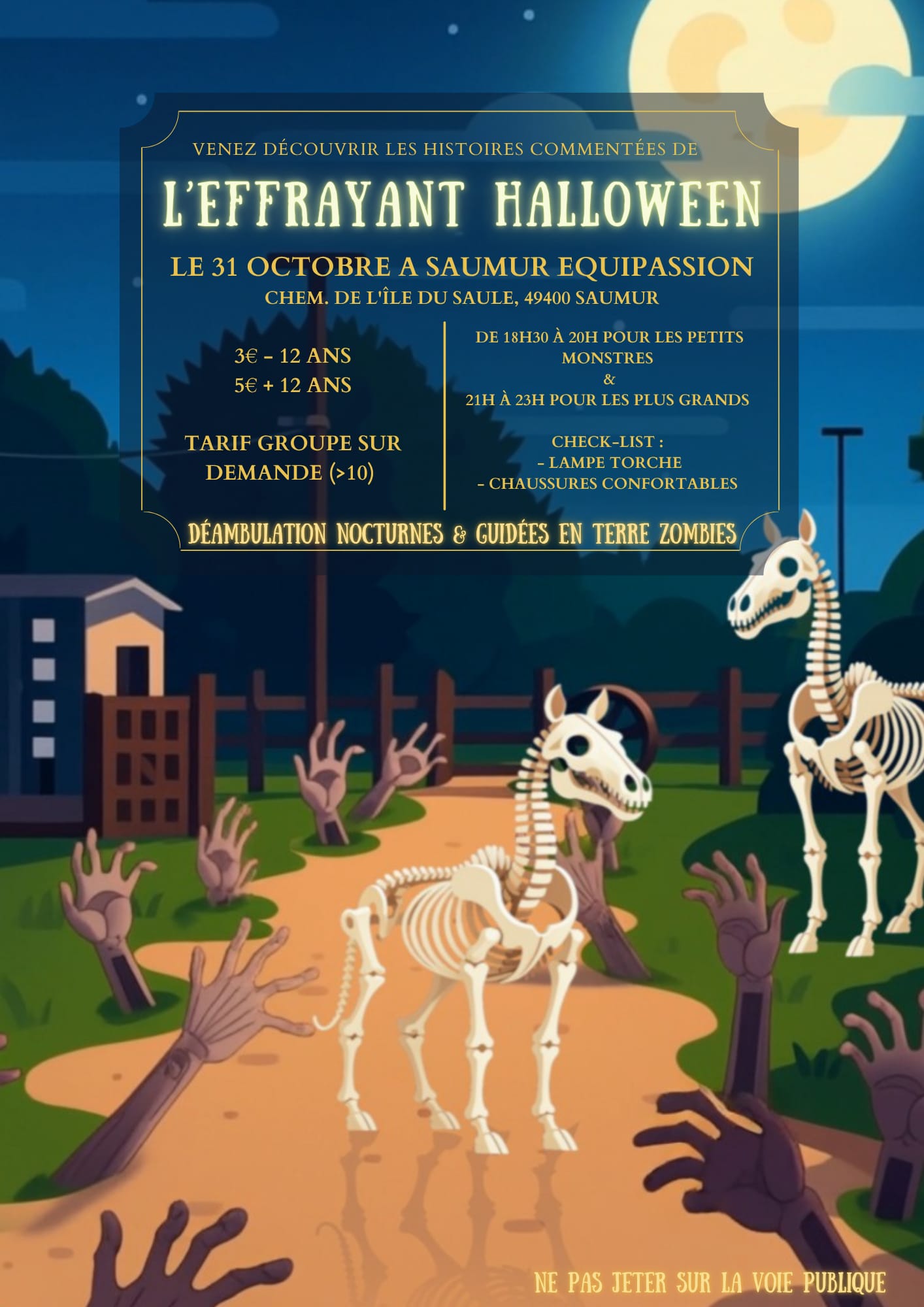 Le pitch : Saumur Équipassion vous invite à la première grande invasion zombie de Saumur ! Que vous soyez porteur saint, survivant, ou déjà zombie, venez propager le virus dans une balade immersive et interactive, guidée à travers les champs… Pensez à vos bottes et vos lampes de poche. Frissons, fun et apocalypse contrôlée garantis !