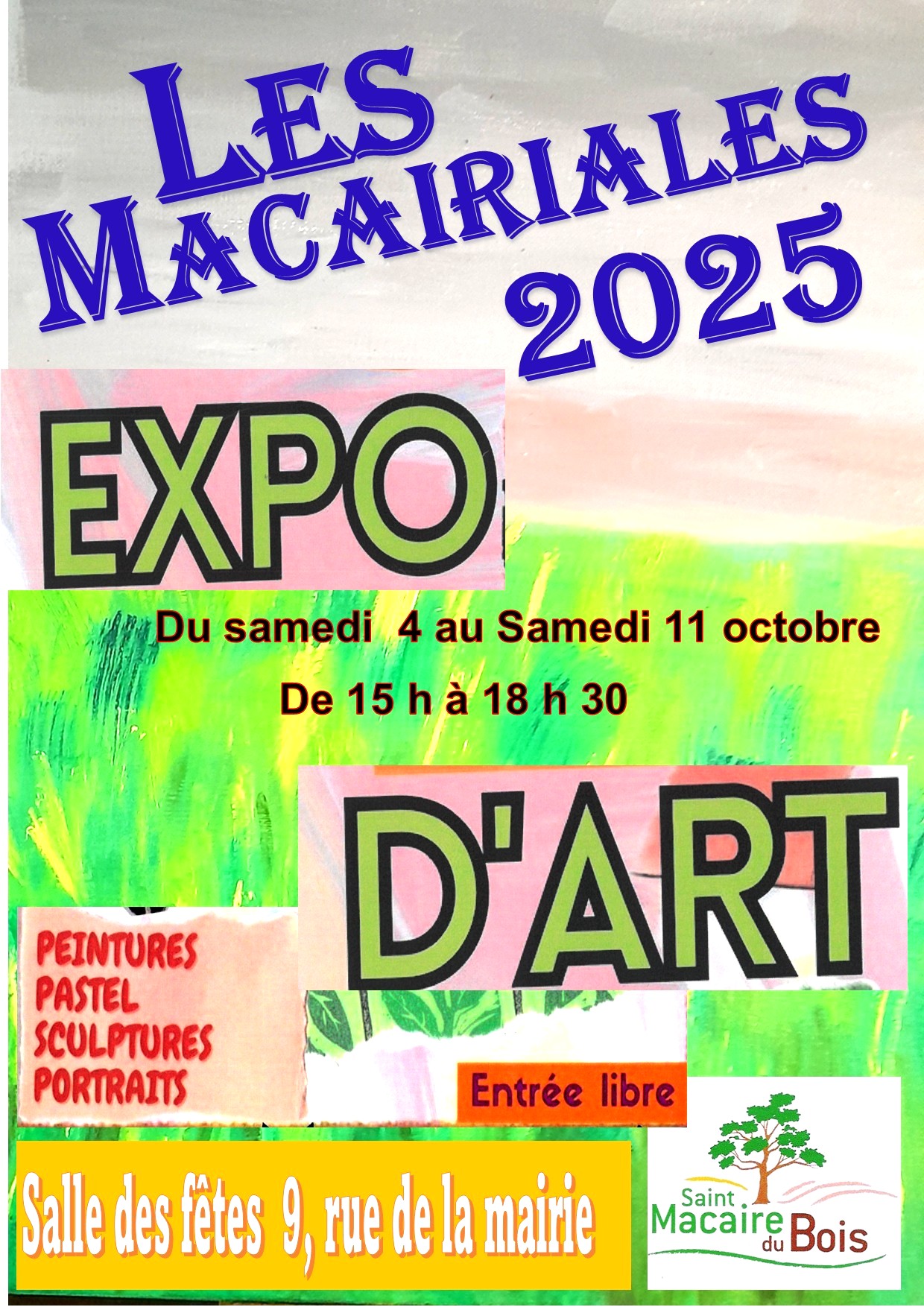 La commune de St Macaire du bois organise sa 14ème exposition artistique les macairiales 2025 en invtant :Eric Crespin sculpteur sur bois , Jacqueline DEROUARD, Jacqueline LECAT, , et comme artistes nouveaux et Inès LUCIUS, Fabienne DAVY, Marline BRUNEAU du45au 11 octobre 2025 entrée libre Macaire du Bois, 9 rue de la mairie . comme chaque année les enfants des 4 classes primaires des écoles de St Macaire du Bois et des Verchers sur Layon participent à cette exposirtion encadrées par l’équipe enseignante.