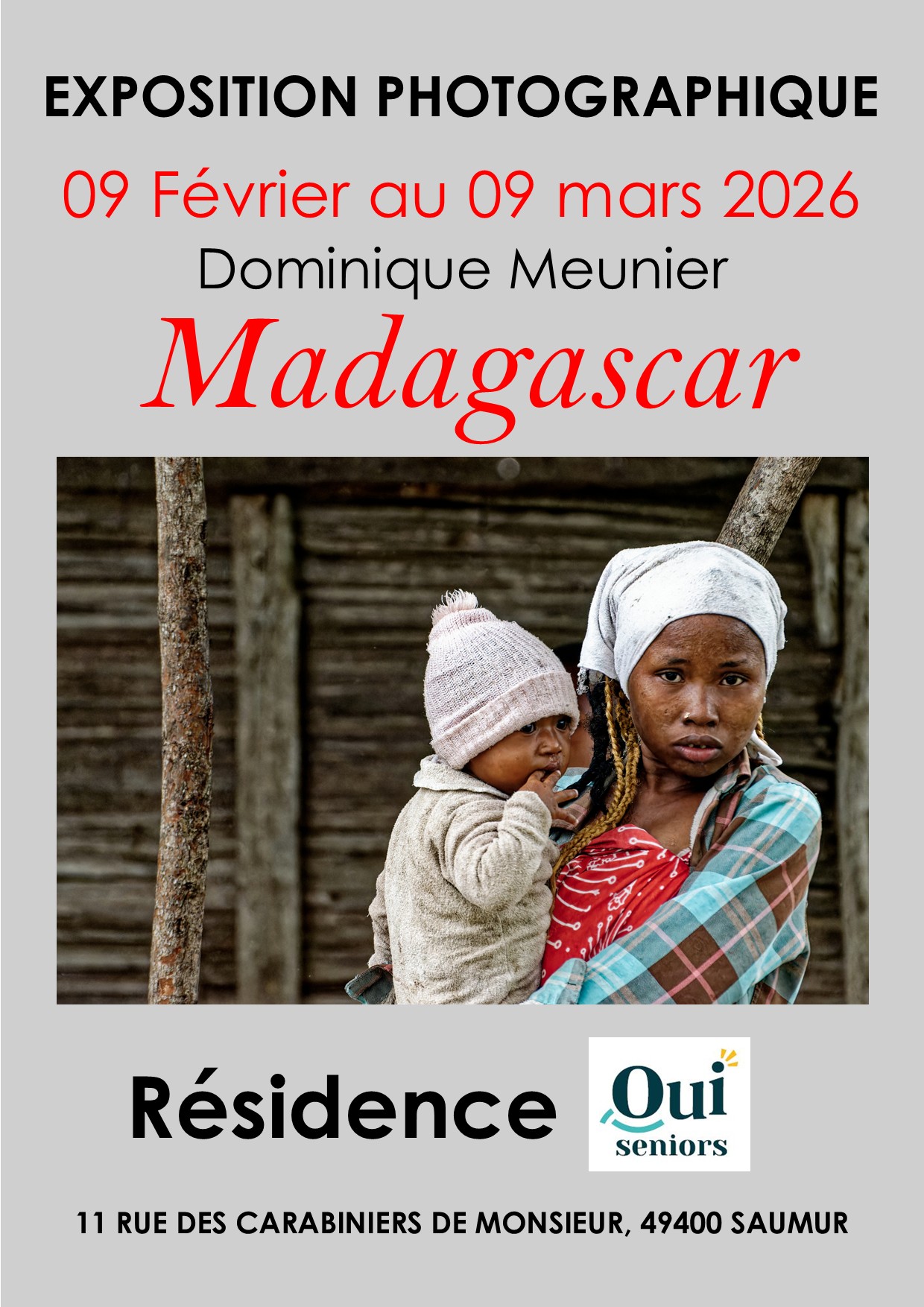 Du 9 février au 9 mars 2026, la résidence Oui Séniors (située au 11 rue des carabiniers de Monsieur à Saumur) accueillera une exposition des photographies de Dominique Meunier : Madagascar.