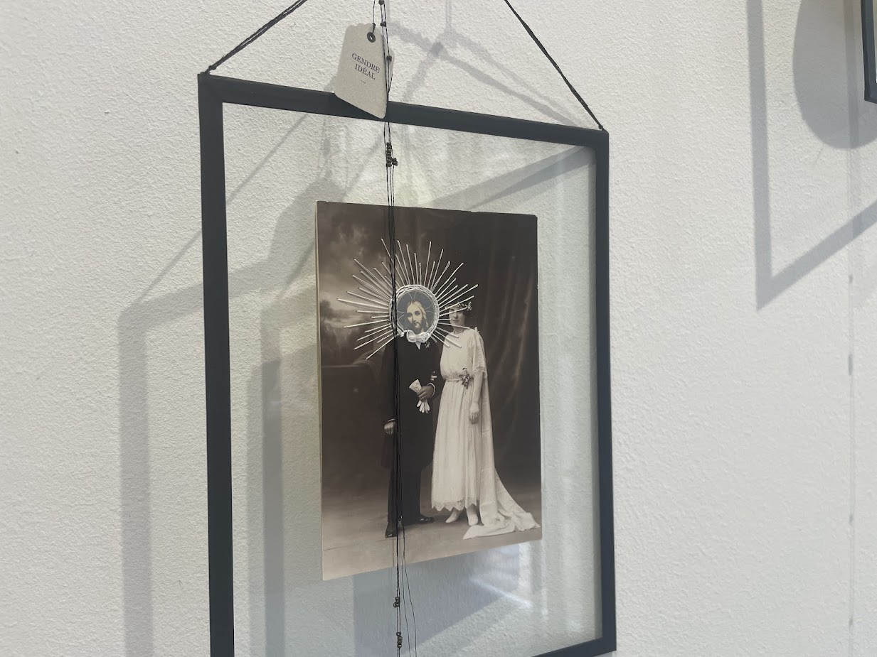 Elle détourne en effet divers objets anciens pour interroger notre rapport au temps qui passe et à la fin des cycles. « L’exposition est construite autour de 3 axes. Au rez-de-chaussée de la galerie, il y a notre passage sur la terre en tant qu’humain avec des photos anciennes détournées avec poésie ou ironie. Puis à l’étage, j’aborde la question du passage dans l’au-delà avec une partie sur comment nous honorons nos morts, et une autre que les indices potentiels que nous avons sur ce qui nous attend ensuite. » Pour cette exposition, qu’elle a montée de toute pièce en l’espace d’un an et demi seulement, ce qui est finalement assez peu au vu des créations, de leur complexité et leur finesse parfois, elle souhaite aussi questionner notre rapport aux symboles et aux rites. En brodeuse qu’elle est, elle reste toujours sur un fil en tentant de rendre la thématique de la mort « lumineuse pour désacraliser le sacré », tout en le respectant et en se demandant « comment s’émanciper des codes et des rituels, tout en conservant le sens et la symbolique » de certains objets ou passages.