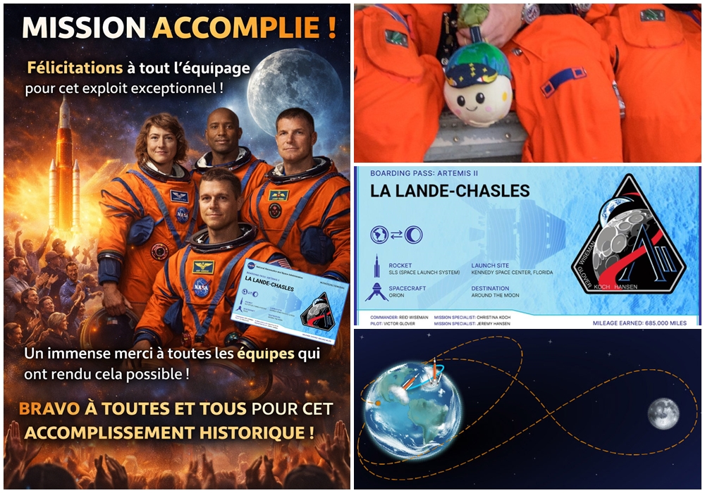 Ce samedi 11 avril 2026, à 2 heures 07, heure française, la mission Artemis II s’est achevée avec succès, marquant une étape majeure dans le retour de l’exploration humaine autour de la Lune. Pilotée par la NASA, cette mission habitée a permis de valider des technologies essentielles en vue des futures expéditions lunaires. À bord du vaisseau Orion, les astronautes ont réalisé un voyage historique autour de la Lune, suscitant l’admiration à travers le monde. Cet accomplissement est avant tout le fruit d’un travail collectif, mobilisant des milliers de femmes et d’hommes, ingénieurs, techniciens et scientifiques. Parmi les millions de soutiens à cette aventure figurait, de manière symbolique, la commune de La Lande-Chasles. Le nom du village faisait en effet partie des plus de 5 600 000 noms enregistrés par la NASA sur une carte SD, elle-même embarquée à bord de la mission, glissée dans la mascotte RISE. Ainsi, sans quitter le sol, La Lande-Chasles a pris part à ce voyage exceptionnel de manière virtuelle, rejoignant symboliquement l’orbite lunaire et cette page d’histoire spatiale. Ce clin d’œil à l’exploration spatiale s’inscrit dans une dynamique plus large portée par la commune, qui nourrit depuis plusieurs années le rêve de voir son blason photographié à bord d’une station spatiale. Une ambition qui a déjà suscité un bel élan, avec plus de 4 700 photos reçues depuis les quatre coins du monde en seulement trois ans. Le succès de Artemis II rappelle que l’exploration spatiale dépasse les frontières et rassemble bien au-delà des centres de décision. Félicitations aux astronautes et à l’ensemble des équipes de la NASA pour cette réussite historique, qui fait rêver et ouvre la voie aux prochaines étapes de la conquête lunaire.
