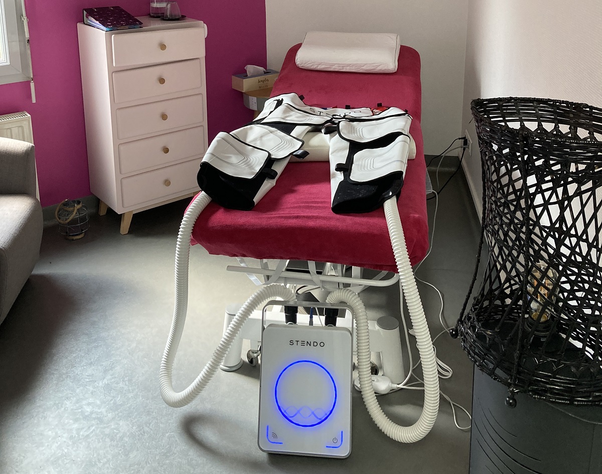 – NOUVEAUTE : la Pulsothérapie STENDO, une solution contre la mauvaise circulation sanguine et lymphatique, qui ralentit notre métabolisme. Booste le retour veineux et soulage les jambes lourdes. Favorise le sommeil, régule le stress. Bien pour la préparation et la récupération des sportifs. Agit également sur la cellulite, affine la silhouette, améliore l’élasticité de la peau et élimine localement la rétention d’eau.