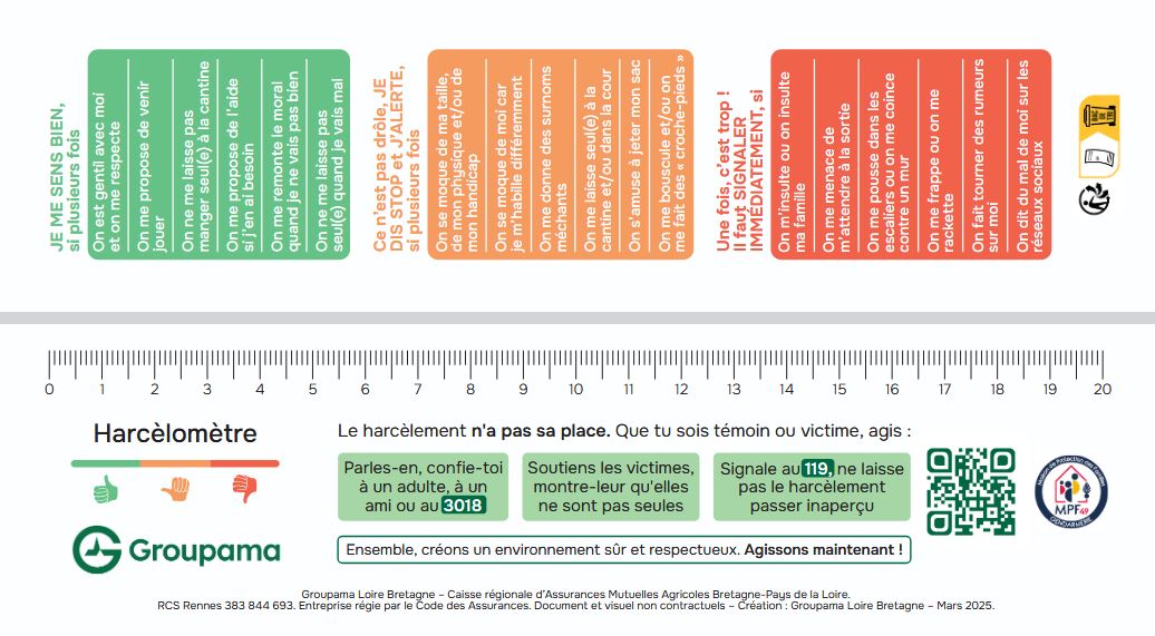 En complément d’actions de prévention menées dans les écoles et collèges mainoligériens, Groupama Loire Bretagne propose, en partenariat avec la MPF49, un outil de détection du harcèlement scolaire, baptisé « harcèlomètre » pour prévenir et inciter à réagir. Il s’agit d’une règle souple permettant à un enfant de jauger le degré de harcèlement dont il pourrait être victime ou témoin. Ce support, d’une longueur de 20cm, affiche également la démarche à suivre en cas de harcèlement comme appeler le 3018 (numéro pour les victimes de cyberharcèlement) ou encore scanner un QR code qui renvoie vers un chat en ligne pour discuter en direct avec la gendarmerie nationale (ouvert 7 jours sur 7 et 24 heures sur 24). Cette opération permet aux élèves de réagir face à une situation de harcèlement grâce à un simple double décimètre aussi pratique qu’informatif et toujours à portée de main dans leur trousse.