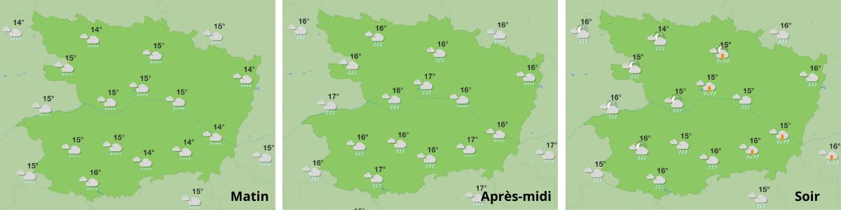 Dimanche : Les pluies faibles et localisées de la matinée pourraient s’intensifier dans l’après-midi avec des averses. Ces dernières vont se généraliser au cours de la soirée, avec parfois quelques éclairs. Les températures seront comprises entre 15°C et 16°C en moyenne.