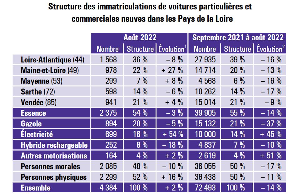 En août 2022, 7 635 véhicules routiers neufs ont été immatriculés dans les Pays de la Loire, en recul de 5,2 % par rapport à août 2021. Ce quinzième repli consécutif est lié aux difficultés d’approvisionnement des constructeurs automobiles. Il s’agit de la plus longue série de baisses depuis celle de 2012/2013. En cumul annuel, les achats de véhicules neufs ont diminué de 14 % par rapport à la période de septembre 2020 à août 2021. Les achats de voitures particulières et commerciales ont représenté 57 % des immatriculations du mois d’août. Ils se sont accrus de 2,0 % par rapport à août 2021, mettant ainsi un terme à quatorze diminutions d’affilée. L’éclaircie est liée au rebond des ventes auprès des personnes physiques. La diversification énergétique du parc automobile s’est accélérée avec la poursuite de la croissance des ventes de voitures fonctionnant à l’électricité et au gaz. Deuxième marché par le nombre de transactions, le segment des camionnettes a reculé de 24 % en août. Sur un an, ses ventes ont chuté de 25 %. Le ralentissement économique et le prix élevé du gazole amènent les entreprises à différer le renouvellement de leur parc.