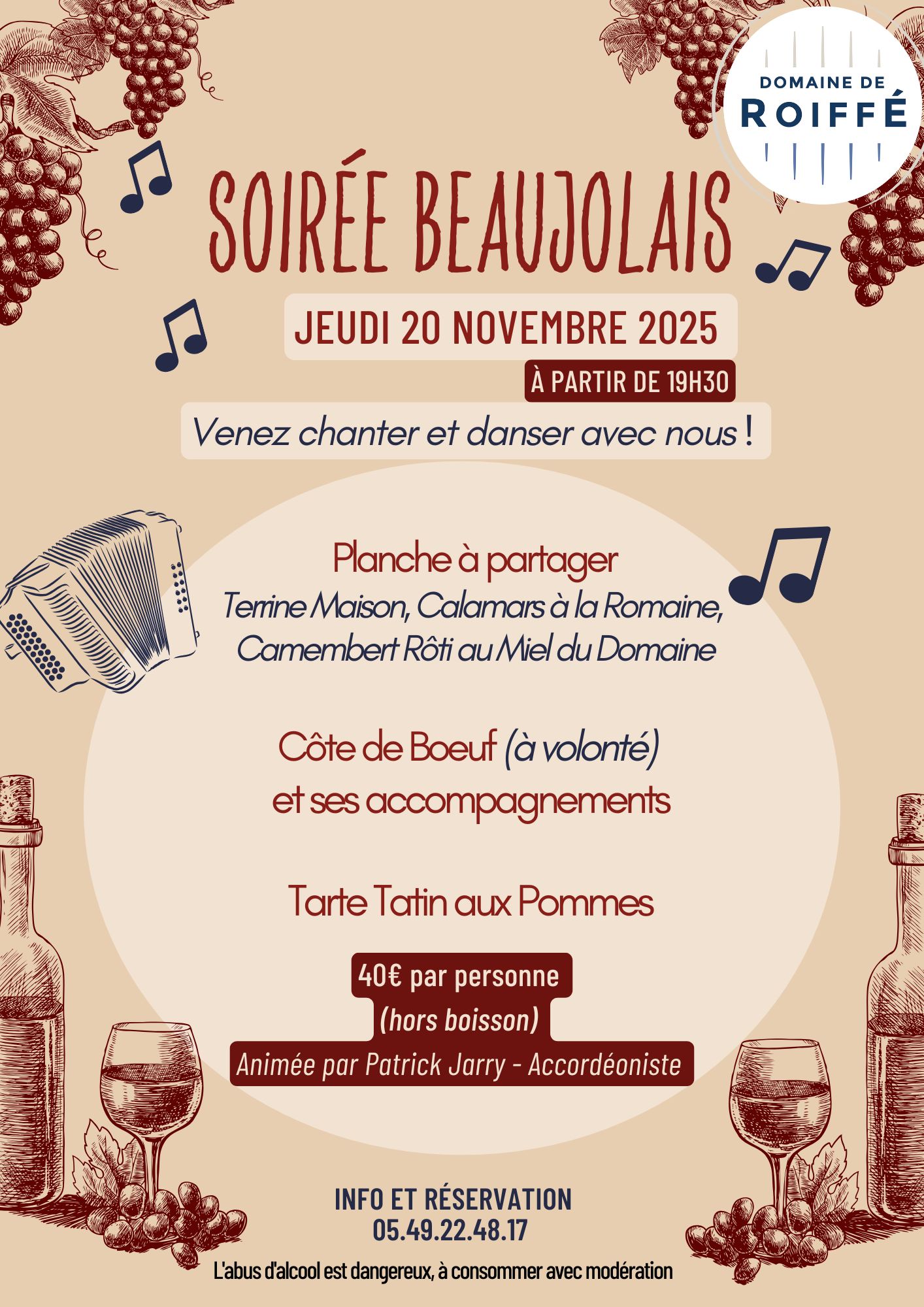 Chantez, dansez et savourez ! Rendez-vous pour une soirée en musique autour du Beaujolais nouveau, avec Patrick Jarry à l’accordéon, pour revisiter les grands classiques de la chanson française.