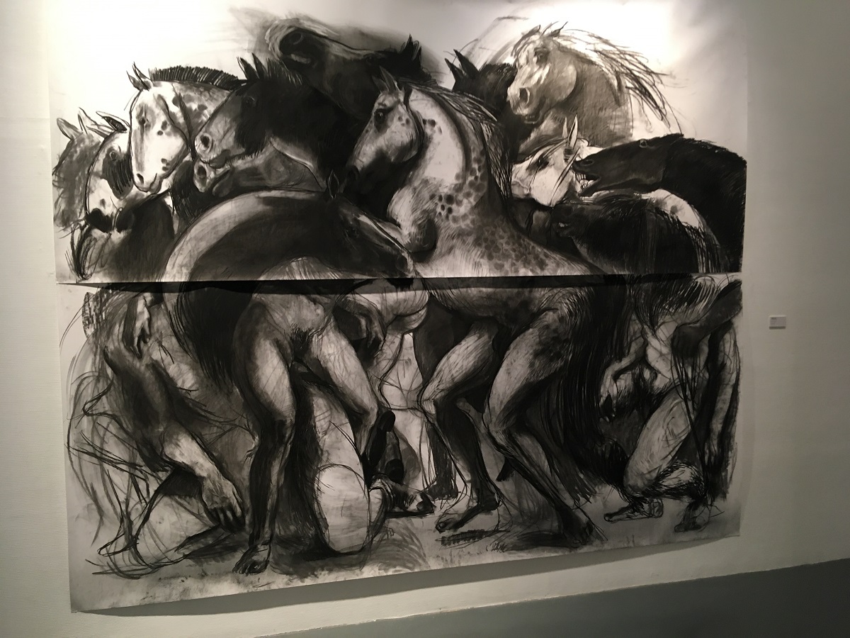 Pour Sidonie Bilger, ce sujet était tout à fait nouveau : « Je ne viens pas du tout du monde équestre. Cette immersion a donc été essentielle dans mon travail de création pour rencontrer le cheval, à travers une vision historique via les musées, une vision sportive avec les compétitions comme la voltige ou le complet, une encore une rencontre de l’animal lui-même. Je suis partie sur une représentation du cheval qui n’est pas complaisante, mais à l’écoute des dissonances dont on m’a fait part lors de ma résidence. Il y a eu, et il y a encore, beaucoup d’évolutions et de changements de pratique concernant notre rapport et notre relation avec l’animal. J’ai toujours travaillé sur les rapports de domination et cet aspect, ce rapport que j’ai trouvé intéressant d’aborder. » Son travail, principalement de grandes fresques dessinées au fusain, évoque le côté mythique et mythologique du cheval au travers de représentations comme le centaure.
