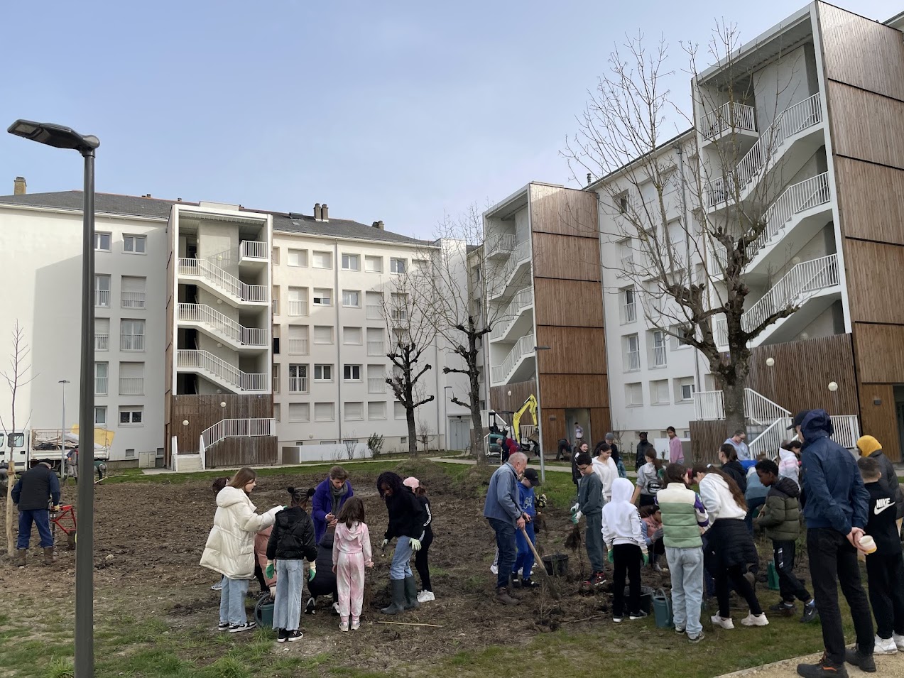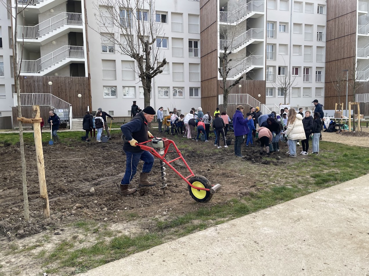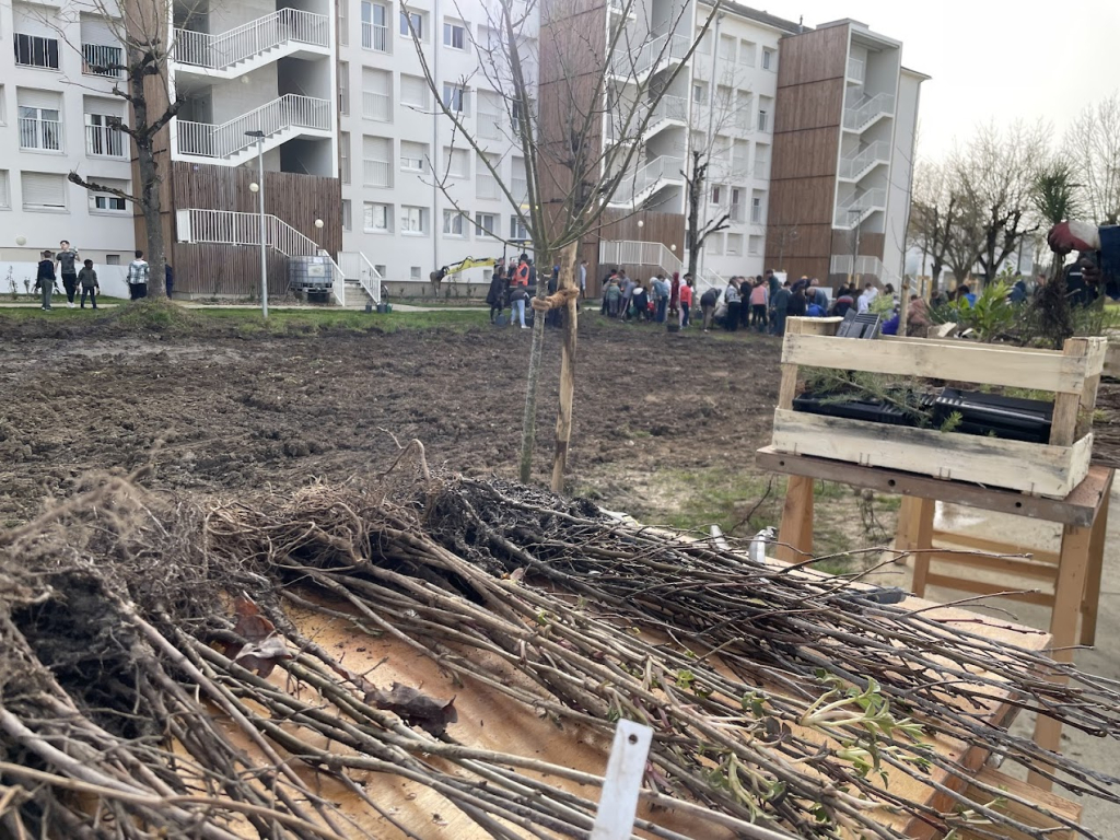 Il y a quelques jours, l’association la Maison des Arbres organisait une vaste opération de plantation à proximité du cinéma le Grand Palace à Saumur. L’objectif : réaliser une micro forêt. Les bénévoles étaient venus nombreux pour prêter main forte et permettre à la nature de reprendre ses droits (relire notre article). Le président de l’association, Patrick Cahuzac commente : « La plantation de dimanche 8 février a été un immense succès. Sous le soleil, oui, miraculeusement présent ce jour-là, nous avons planté nos 1300 arbres et arbustes dans la joie coutumière à l’association. Plus de 40 adhérents et bénévoles ont participé à cette journée inoubliable ». Ce jeudi 5 mars 2026, une nouvelle plantation a eu lieu. Décidément, les micro-forêts poussent comme des champignons en Saumurois ! En effet, le bailleur social Saumur Habitat organisait avec l’association, la plantation d’une micro-forêt au cœur de l’ensemble immobilier Gay Lussac, situé dans le quartier du Chemin Vert à Saumur. Cette plantation est financée par Saumur Habitat. Elle s’inscrit dans le cadre du projet « Demain, la forêt », lancé par l’association la Maison des Arbres en 2022. Une fois encore, de nombreuses personnes ont participé à la plantation de cette micro-forêt. Parmi elles, une vingtaine de bénévoles de la Maison des Arbres, association locale œuvrant pour la reforestation sur le territoire saumurois. Ils ont été accompagnés, dans la matinée, par une cinquantaine d’élèves allant de CE1 et de CM2 de l’école des Violettes et des éco-délégués du collège Pierre Mendès France qui avaient ensuite la charge de promouvoir l’opération auprès de leurs camarades.