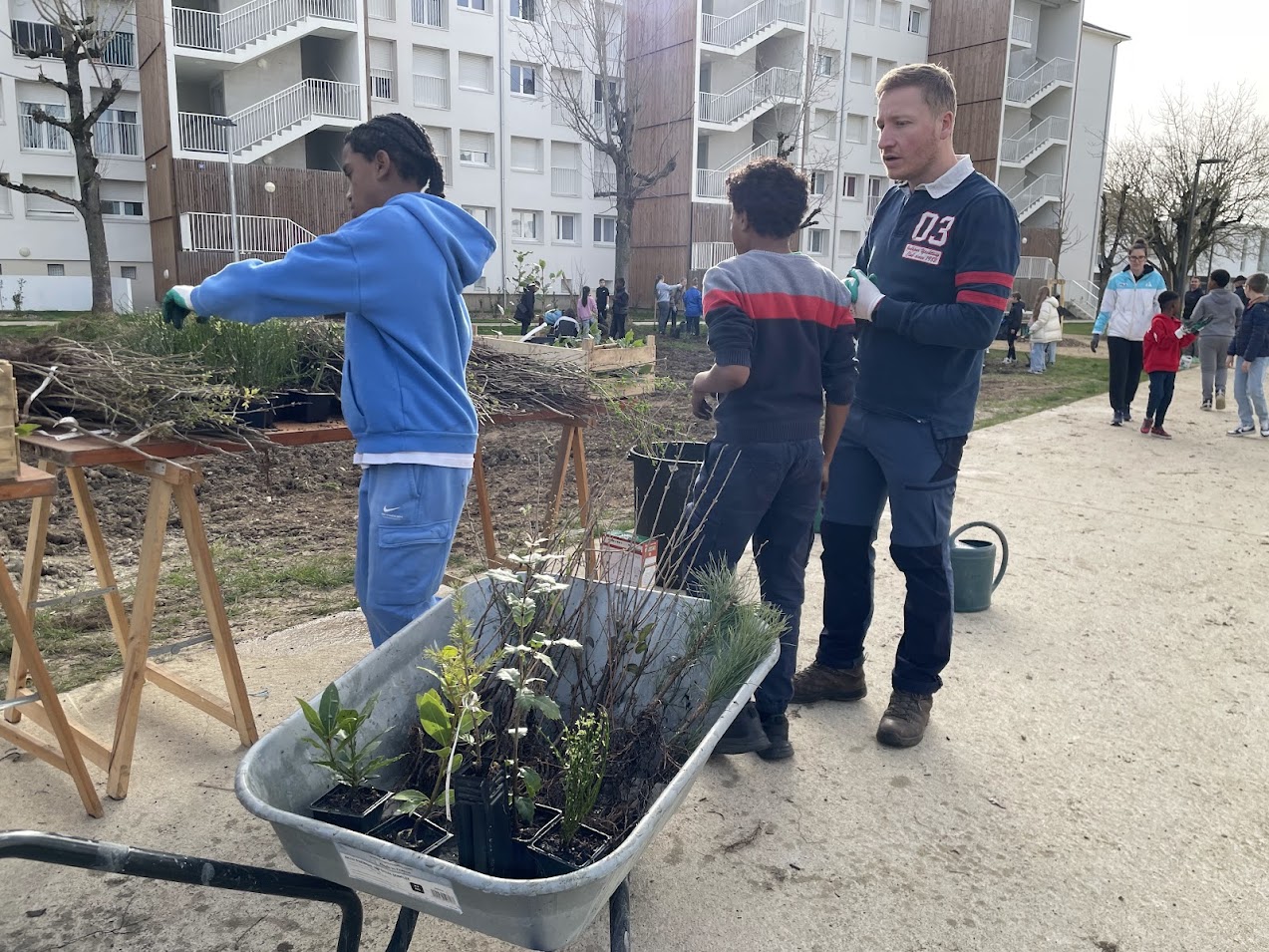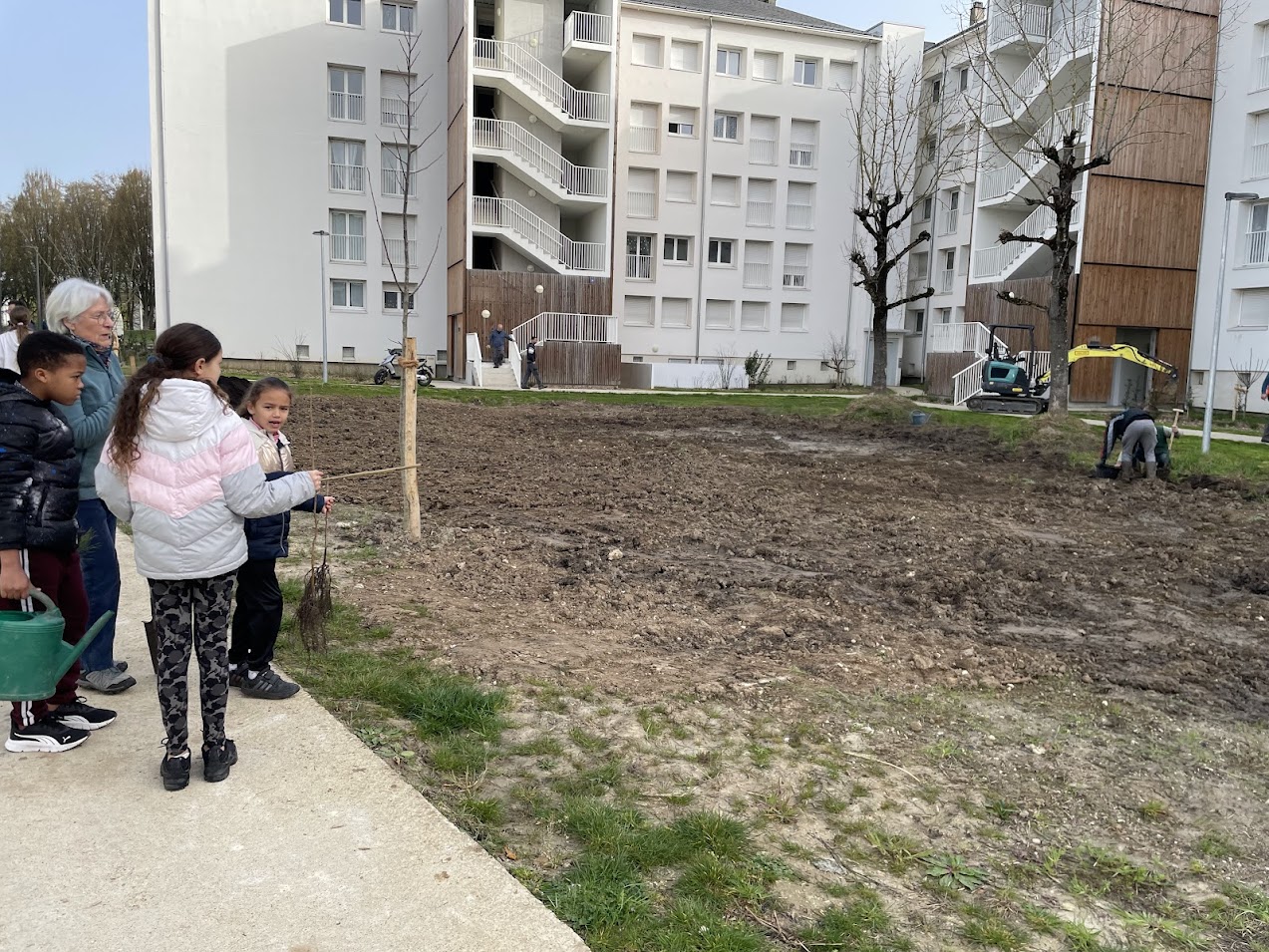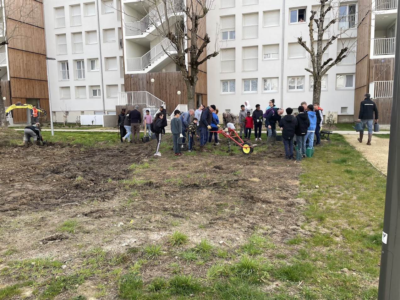 Il y a quelques jours, l’association la Maison des Arbres organisait une vaste opération de plantation à proximité du cinéma le Grand Palace à Saumur. L’objectif : réaliser une micro forêt. Les bénévoles étaient venus nombreux pour prêter main forte et permettre à la nature de reprendre ses droits (relire notre article). Le président de l’association, Patrick Cahuzac commente : « La plantation de dimanche 8 février a été un immense succès. Sous le soleil, oui, miraculeusement présent ce jour-là, nous avons planté nos 1300 arbres et arbustes dans la joie coutumière à l’association. Plus de 40 adhérents et bénévoles ont participé à cette journée inoubliable ». Ce jeudi 5 mars 2026, une nouvelle plantation a eu lieu. Décidément, les micro-forêts poussent comme des champignons en Saumurois ! En effet, le bailleur social Saumur Habitat organisait avec l’association, la plantation d’une micro-forêt au cœur de l’ensemble immobilier Gay Lussac, situé dans le quartier du Chemin Vert à Saumur. Cette plantation est financée par Saumur Habitat. Elle s’inscrit dans le cadre du projet « Demain, la forêt », lancé par l’association la Maison des Arbres en 2022. Une fois encore, de nombreuses personnes ont participé à la plantation de cette micro-forêt. Parmi elles, une vingtaine de bénévoles de la Maison des Arbres, association locale œuvrant pour la reforestation sur le territoire saumurois. Ils ont été accompagnés, dans la matinée, par une cinquantaine d’élèves allant de CE1 et de CM2 de l’école des Violettes et des éco-délégués du collège Pierre Mendès France qui avaient ensuite la charge de promouvoir l’opération auprès de leurs camarades.