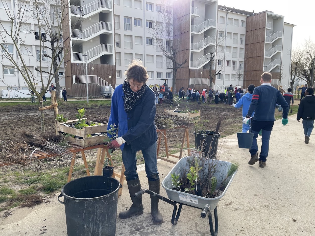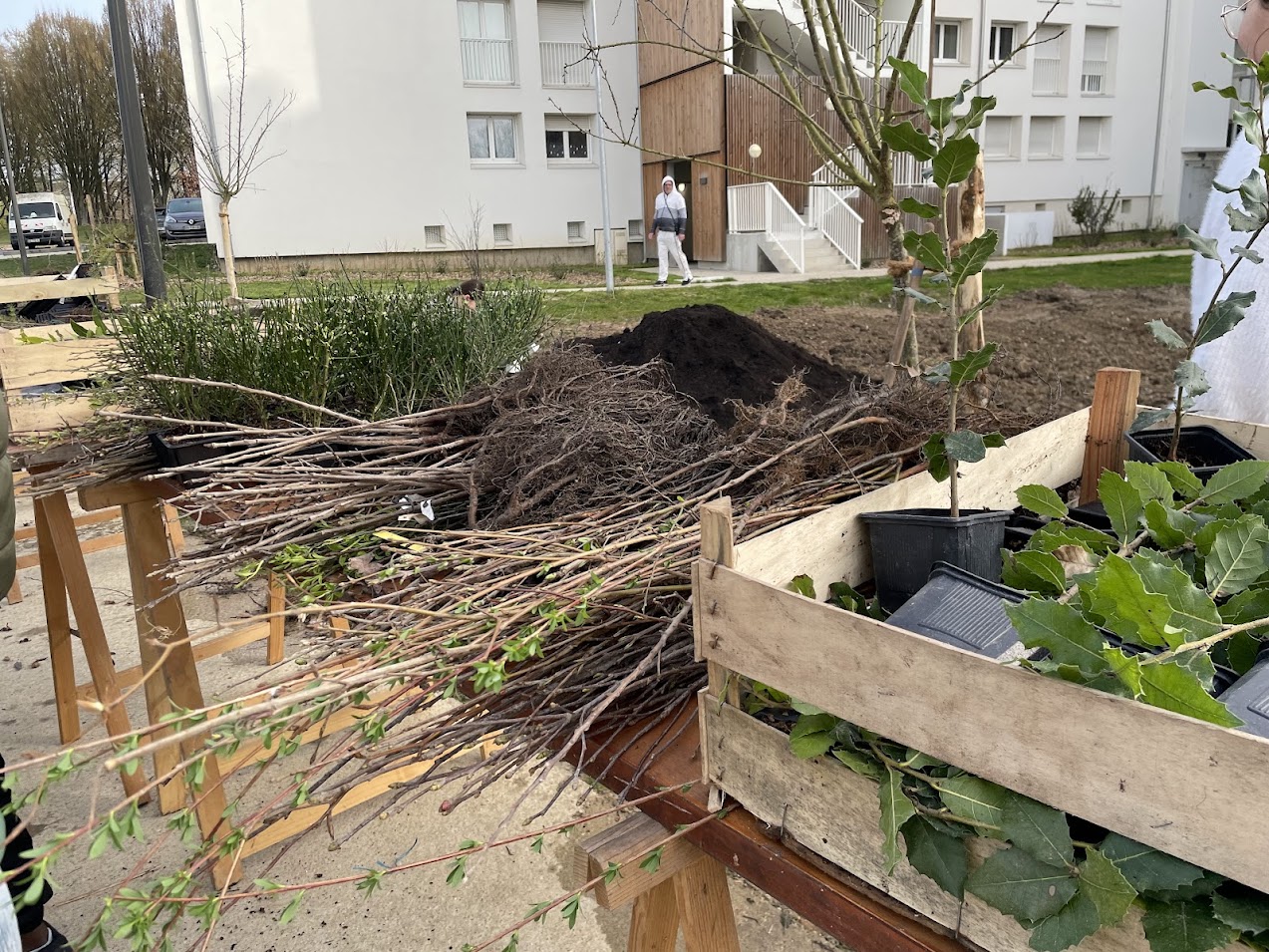 Une opération délicate et particulièrement boueuse ce jeudi matin. “Le sol est très argileux et les pluies de ces derniers jours ont rendu le sol extrêmement humide et complique un peu la plantation”, explique Patrick Cahuzac qui s’est enfoncé jusqu’aux genoux dans l’argile collante. Pour répondre à cette problématique d’humidité, l’association a prévue de planter des espèces adaptées aux milieux humides sur la zone en question. Au total, une trentaine d’espèces végétales de toutes tailles prendront racine au cœur de ce milieu urbanisé. Ce sont plus de 1000 végétaux qui vont grandir sur ces 500m2. “L’objectif de ce dispositif était de renaturer le site, qui était très minéral et urbanisé avant d’être rénové”, explique Sébastien Bodin, responsable d’opération chez Saumur Habitat. “Nous avons détruit les anciens parkings, enlevé l’enrobé et créé des espaces verts. Cela crée un environnement apaisant et permet de créer un îlot de fraicheur sur un secteur où il pouvait faire très chaud en été. Cela vise aussi à capter les eaux de pluie. L’idée à terme est d’utiliser cette micro-forêt comme outil pédagogique pour les habitants et les écoles avec également l’installation de nichoirs pour compter les oiseaux présents. Par ailleurs, cela permet d’installer un autre relationnel avec les habitants autour d’un projet positif”, ajoute-t-il.