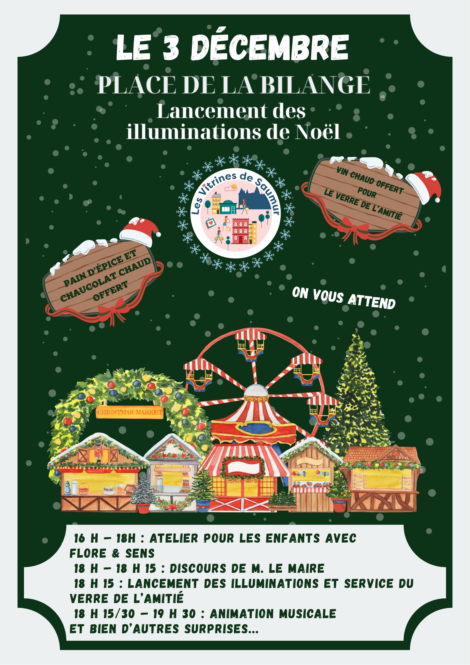 Le mois de décembre est arrivé et avec lui les traditionnels rendez-vous et festivités de Noël. Ce mercredi 3 décembre 2025, la ville de Saumur s’installera dans sa parure de fête avec notamment le lancement officiel des illuminations de la ville de Saumur. Un moment féérique pour tous les âges. L’association des vitrines de Saumur sera de la partie et offrira le vin chaud et le pain d’épices aux Saumurois présents. Rendez-vous est donné sous le grand sapin, place de la Bilange à partir de 18h15. A noter que le Père Noël sera présent sur place de 17h à 19h. Par ailleurs, un atelier pour les enfants est prévu de 16h à 18h avec Flore et Sens, un chocolat chaud leur sera proposé. L’ensemble de cuivres de l’École de Musique Saumur Val de Loire se chargera de l’animation musicale de 18h30 à 19h30.