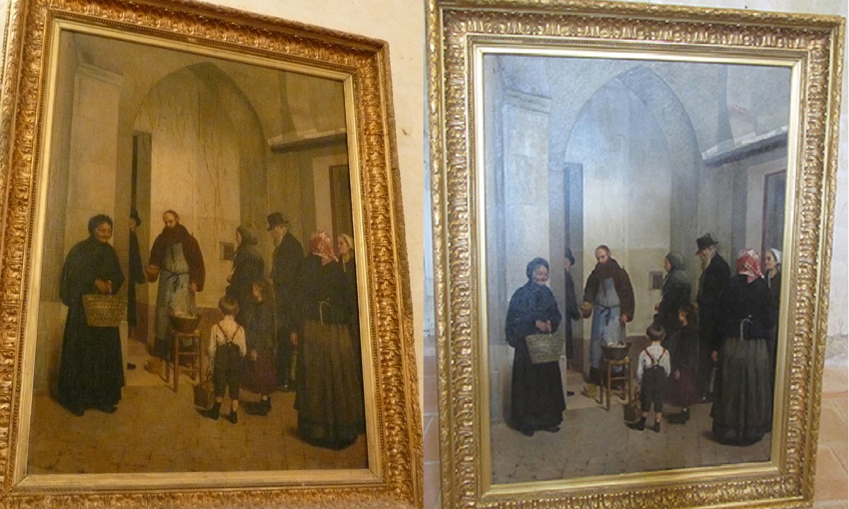 Avec le temps, le tableau et son cadre avaient perdu tout leur éclat. Sur la peinture, l’épais vernis (appliqué à la hâte, sans doute juste avant d’exposer le tableau au Salon comme c’était fréquemment le cas) était hétérogène, avec d’importantes coulures et son oxydation avait fini par provoquer un jaunissement généralisé de la toile. Le grand cadre de style Barbizon, fait de stuc cuivré sur âme de bois, présentait de nombreuses fissures des moulures et des manques, fragilités plusieurs fois réparées, qui allaient en s’accentuant avec le temps. Il était donc grand temps de le restaurer. Deux restaurateurs ont été retenus pour rendre sa qualité au tableau : Sébastien Rallet de Venansault en Vendée pour le tableau et Marie-Sophie Greffier de l’atelier du Bois Doré à Saumur pour le cadre. Après plusieurs mois de travail, le tableau et son cadre sont donc de retour et le tableau sera officiellement dévoilé aux habitants de Dampierre-sur-Loire lors des vœux de madame Liébault, maire déléguée de Dampierre-sur-Loire le 25 janvier prochain avant d’être réinstallé dans l’église Saint-Pierre de Dampierre-sur-Loire. Il pourra être vu ensuite lors des cérémonies se déroulant dans l’église ou pendant les Journées Européennes du Patrimoine en septembre prochain. Les travaux de restauration ont reçu le soutien financier du Département de Maine-et-Loire à hauteur de 50% du montant total.