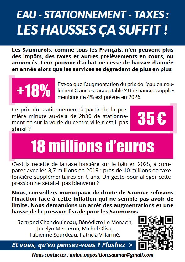 « A Saumur, l’augmentation du prix de l’eau a très largement dépassé les engagements pris par l’Agglomération Saumur Val de Loire en 2020, qui étaient de 1,5% par an jusqu’en 2026 », estiment les deux groupes d’opposition au conseil municipal de Saumur qui ont décidé de faire front commun pour le pouvoir d’achat des Saumurois. « Si cet engagement a été respecté en 2021 et 2022, l’augmentation en 2023 a été de 5%, celle de 2024 de 8 %, celle de 2025 de 4% (relire notre article) et celle de 2026 sera à nouveau de 4%. Au total, notre eau aura augmenté de plus de 20 % pendant le mandat qui se termine » ajoutent les listes Saumur Ensemble et Saumur en Premier. Ils dénoncent également l’augmentation du coût du stationnement. « Sur la voirie en zone orange (centre-ville de Saumur), le tarif passe de 2,20€ pour une durée entre 1h00 et 2h00, à 35 euros pour une durée supérieure à 2h00 (relire notre article sur le sujet). Il nous paraît que cette mesure est abusive en matière de prix du stationnement sur la voirie et vise peut-être à éloigner les voitures du centre de Saumur où stationner devient par ailleurs de plus en plus difficile. » « Ces tarifs visent à réguler efficacement l’usage des places de stationnement en centre-ville », expliquait alors la ville de Saumur lors du vote de cette mesure en février dernier. Enfin, les oppositions saumuroises citent la taxe foncière. Elle estiment que celle-ci a « considérablement augmenté en quelques années ». « Ce phénomène est essentiellement dû à l’augmentation de la base de calcul de cette taxe, décidée par un État soucieux de compenser la disparition de la taxe d’habitation sur les résidences principales. Le taux appliqué par la ville de Saumur à cette base, lui, n’a certes pas augmenté depuis une dizaine d’années », reconnaissent-elles. Mais le taux « n’a pas non plus diminué pour alléger l’impact de l’augmentation décidée par l’État », poursuivent-elles. « Ce taux, de 46,67% sur les propriétés bâties, se situe certes dans la moyenne du Maine-et-Loire, mais est largement supérieur, avec celui de la Mayenne, au taux appliqué dans la région des Pays-de-la Loire (référence : https://amarion35.github.io/taxe-fonciere-map/index.html). Nous souhaitons une action significative sur une taxe qui peut inquiéter aujourd’hui celles et ceux qui souhaitent notamment accéder à la propriété », concluent les élus.