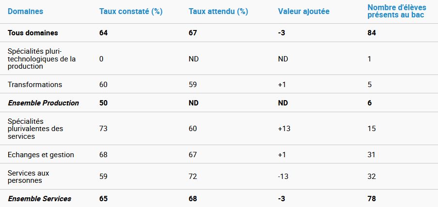 Taux de réussite au baccalauréat 2021 : C’est la part de bacheliers parmi les élèves ayant passé le baccalauréat. Il rapporte le nombre d’élèves du lycée reçus au baccalauréat au nombre de ceux qui se sont présentés à l’examen. Dans l’établissement, 78% des 137 élèves présents au baccalauréat ont obtenu leur diplôme. Le taux de réussite attendu, étant donné les caractéristiques des élèves, était de 86%. Le taux de réussite constaté est inférieur de 8 points au taux attendu, ce qui correspond à une valeur ajoutée pour l’établissement de -8.