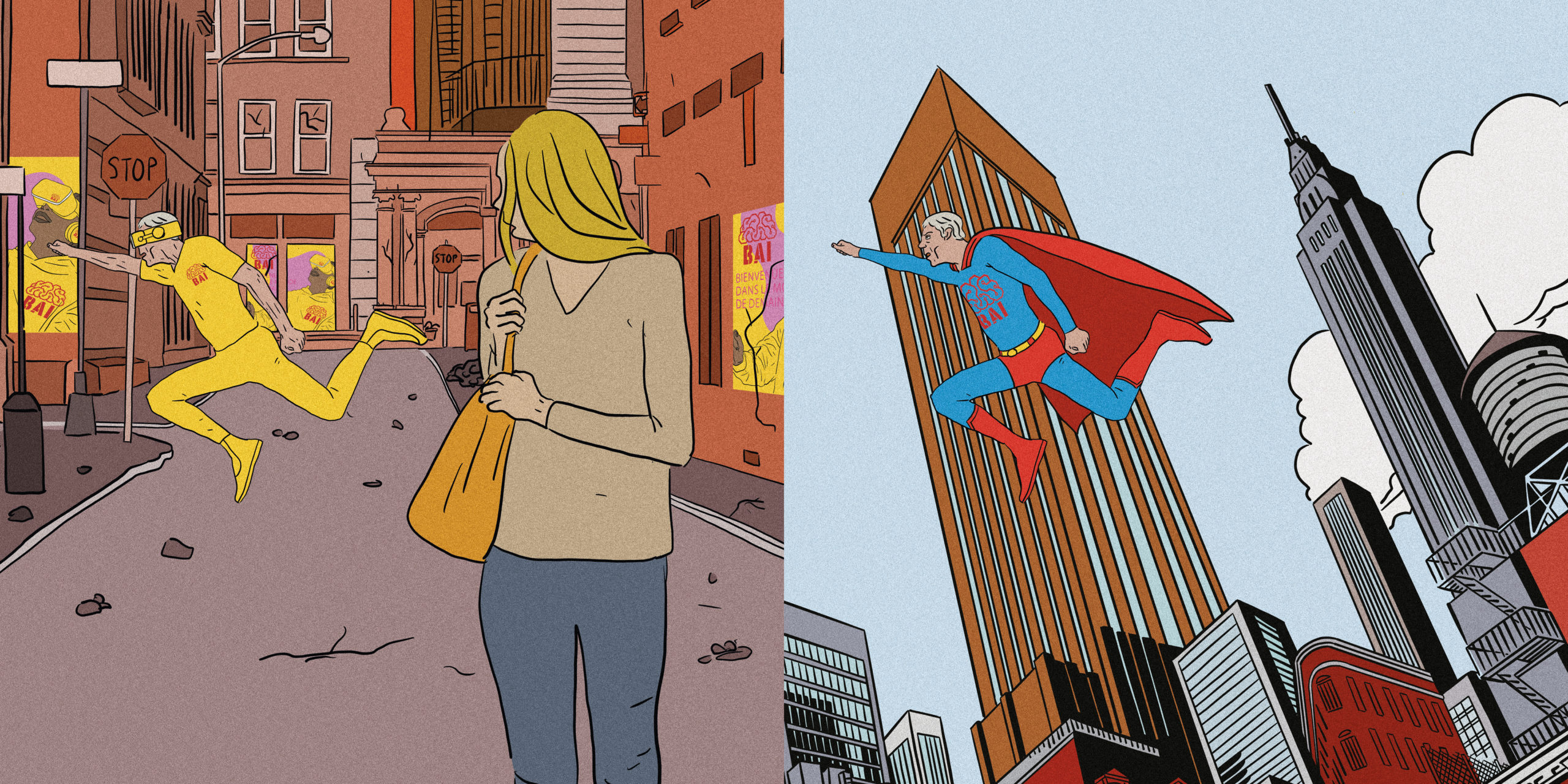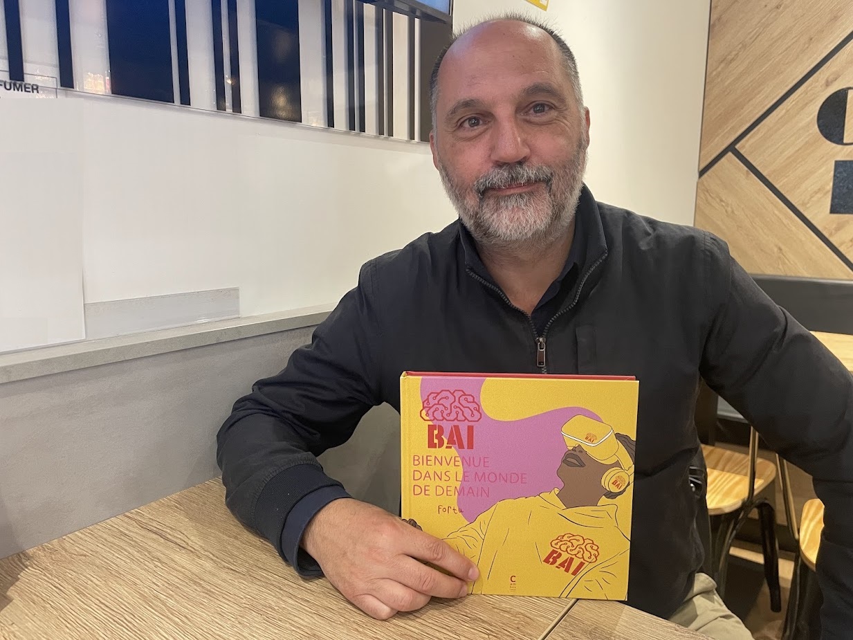 On dit souvent qu’une image vaut mille mots, cette expression, Fortu l’a prise au mot ! En effet, dans « BAI », c’est le nom du livre, on ne trouve que des illustrations. Aucun texte, si ce n’est au début pour contextualiser les choses : « BAI, Brain Artificial Intelligence. BAI est une entreprise spécialisée dans le métavers et les intelligences artificielles. Dans un monde en mutation, rempli d’incertitudes, de conflits idéologiques, où le changement climatique, la diminution des ressources terrestres et la pollution deviennent notre quotidien, BAI vous propose de changer de réalité, de vivre la vie que vous méritez. Donnez-nous les clés de votre cerveau et laissez-vous porter vers une vie de rêve… ». Le décor est posé ! Cette idée originale lui vient « d’un voyage au Portugal où j’ai trouvé un livre, portugais, sans texte. J’ai été surpris par l’intelligence du procédé qui permet de faire comprendre malgré tout un message et de laisser libre cours à l’imagination, à l’interprétation et à de multiples compréhensions », explique-t-il.