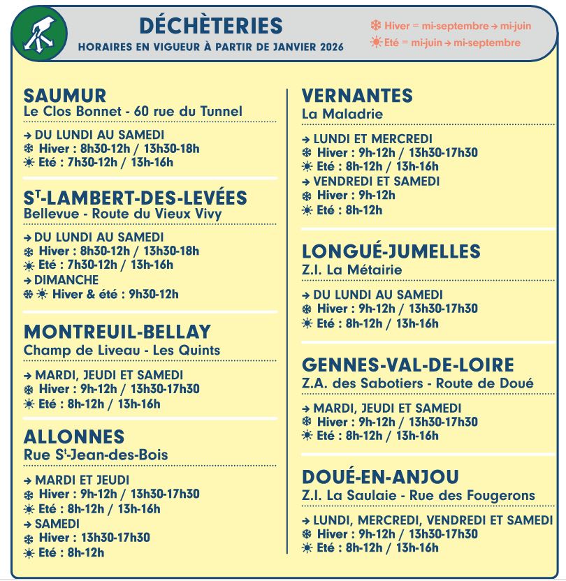 Selon l’agglomération, cette évolution des horaires présente de nombreux avantages : « Une meilleure protection des agents, moins exposés aux températures extrêmes ; Une protection valant également pour les usagers ; Une continuité de service renforcée, avec moins de fermetures imprévues liées aux conditions climatiques ; Une organisation plus efficace, tenant compte des périodes de forte affluence ; Un service public plus durable, en phase avec les enjeux climatiques actuels ». A noter que le volume d’heures d’ouverture cumulé des 8 déchèteries sera identique aux années passées et que la complémentarité de certaines déchèteries sera maintenue notamment pour les déchèteries proches : Allonnes et Vernantes ainsi que Montreuil-Bellay et Doué-en-Anjou (quand l’une sera fermée, l’autre sera ouverte). L’Agglomération accompagnera cette évolution par une information claire auprès des habitants, notamment par affichage sur site et via ses supports de communication (guide horaire des déchèteries, informations aux communes, site Internet de Kyrielle, réseaux sociaux…). Les agents, quant à eux, sont associés à la démarche afin d’assurer une organisation équilibrée et adaptée aux réalités du terrain.