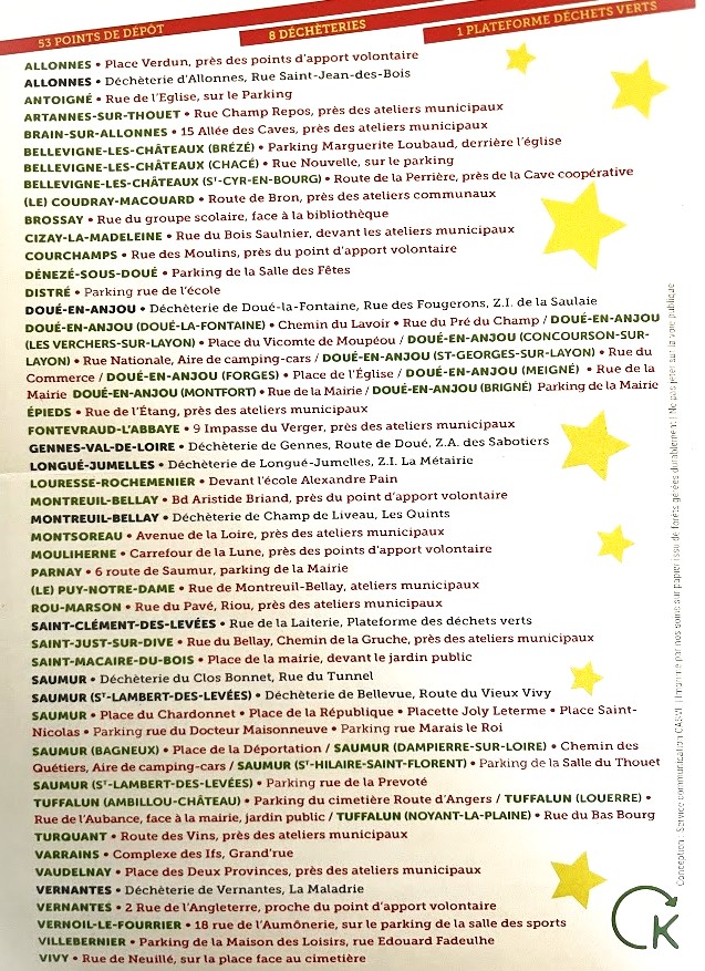 Infos pratiques : Plus de renseignements auprès de Kyrielle – Service Déchets ménagers de l’Agglomération Saumur Val de Loire au 02 41 50 44 67 ou à accueil@agglopropre49.fr.