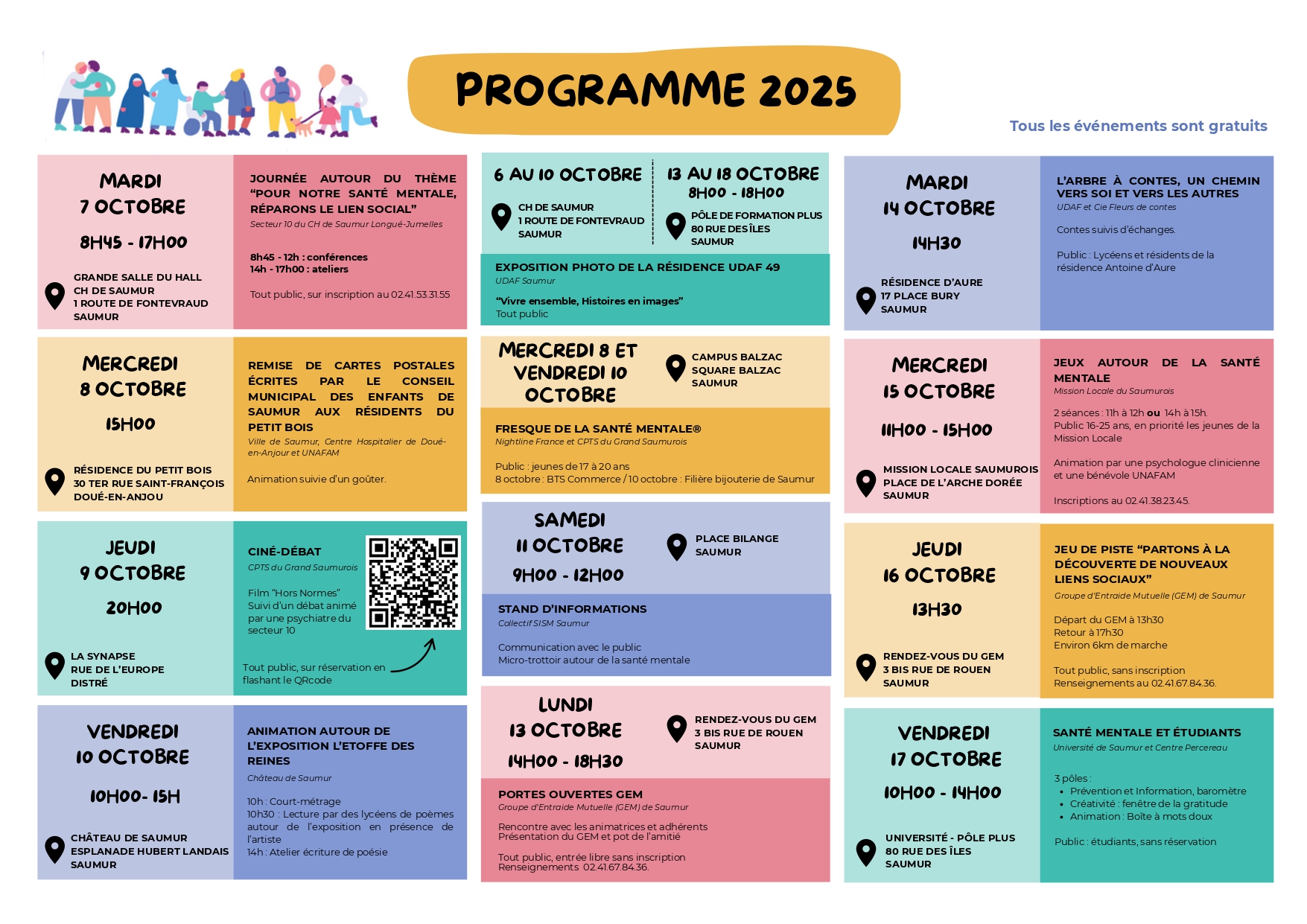 À Saumur, un collectif créé en 2024, élargi cette année, s’est mobilisé pour proposer un programme riche et gratuit. Le centre hospitalier secteur 10, l’UNAFAM, la CPTS du Grand Saumurois, les Rendez-vous du GEM, la résidence-accueil UDAF, la Mission Locale, le centre social Percereau, l’Université d’Angers, le Château de Saumur, la résidence du Petit-Bois de Doué-en-Anjou et la Ville de Saumur se sont associés pour offrir de nombreux rendez-vous. Conférences, ateliers, visites, jeu de piste, stands d’information, rencontres intergénérationnelles, expositions, fresque de la santé mentale, jeux, ciné-débat et contes seront proposés gratuitement à tous. L’équipe SISM sera présente le samedi 11 octobre sur le marché de Saumur, avec un stand de sensibilisation et d’échanges. Le programme complet est disponible sur : https://www.ch-saumur.fr/actualites/semaine-de-la-sant%C3%A9-mentale-2025. « L’ensemble des partenaires s’est engagé bénévolement afin d’offrir des animations porteuses de lien social, de partage et d’espoir. Ces Semaines d’Information sur la Santé Mentale sont l’occasion de redonner toute sa place à la parole, à l’écoute et à la solidarité dans notre quotidien », souligne le collectif.