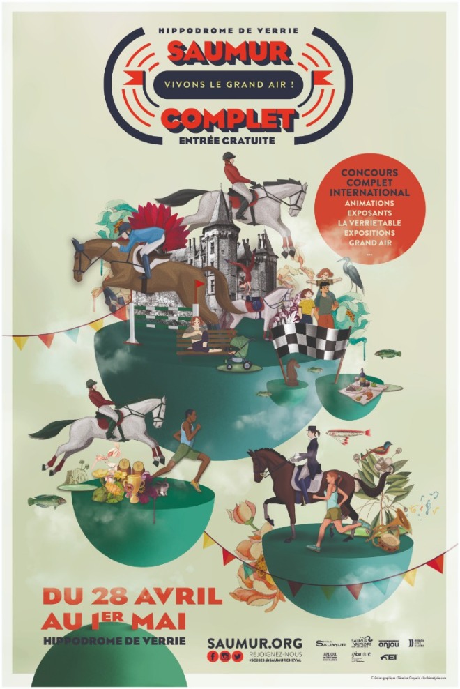 Chaque année, et pour renforcer sa dimension culturelle, le Comité Equestre fait appel à un artiste pour illustrer l’événement. En 2023, c’est Séverine Coquelin qui a été choisie. A partir d’un cahier des charges, l’artiste était ensuite libre de laisser court à sa créativité afin de créer un visuel reflétant cet événement hétéroclite implanté sur le territoire Saumurois depuis de nombreuses années. Depuis 11 ans Séverine Coquelin accompagne ses clients dans leurs projets de communication visuelle et vit chacun de ses projets comme une expérience inédite. Quelle soit graphique ou artistique, cette expérience est avant tout humaine et sensible afin de répondre au mieux aux attentes de chacun. Exigeante, disponible et réactive, Séverine Coquelin réunit ses compétences au sein du studio La vilaine est jolie et s’entoure d’un réseau de partenaires adaptés à chaque projet : designers, photographes, vidéastes, développeurs, motion designers, correcteurs/relecteurs, philosophes… permettront de créer un univers visuel qui vous ressemble. Graphiste et plasticienne de formation, Séverine Coquelin mène donc de front ces deux activités complémentaires. En parallèle de ses projets de communication, elle poursuit sa démarche artistique personnelle et expose son travail. Ces échanges intellectuels, transversaux et complémentaires viendront nourrir et enrichir sa démarche plastique et graphique. Pour la 37e édition de Saumur Complet, des goodies à l’effigie de l’événement et de l’illustration de Séverine Coquelin seront proposés à la vente durant l’événement et en amont sur le site internet www.saumur.org.