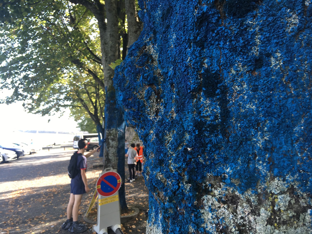 Ce mercredi 11 octobre 2023, quelques jeunes de la SCOOPE ont peint des arbres des quais de la Loire en bleu pour illustrer la hauteur atteinte par l'eau lors de la crue centennale de 1856. Une action similaire avait été menée fin septembre à Allonnes....